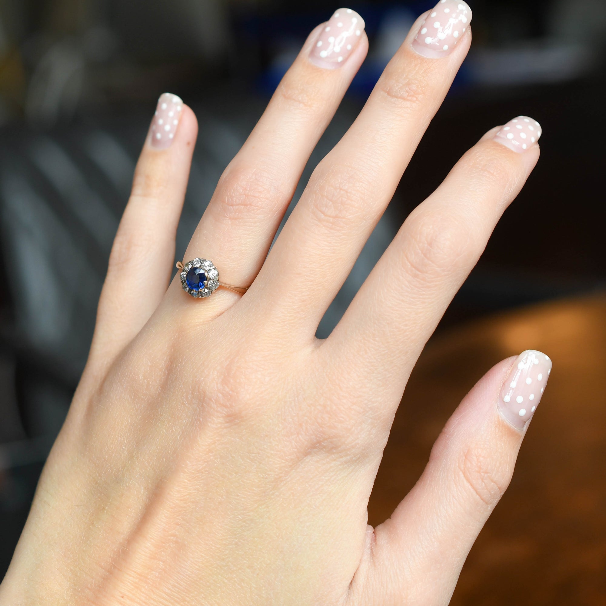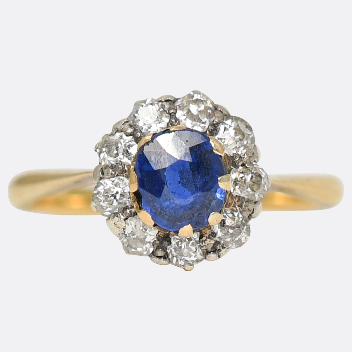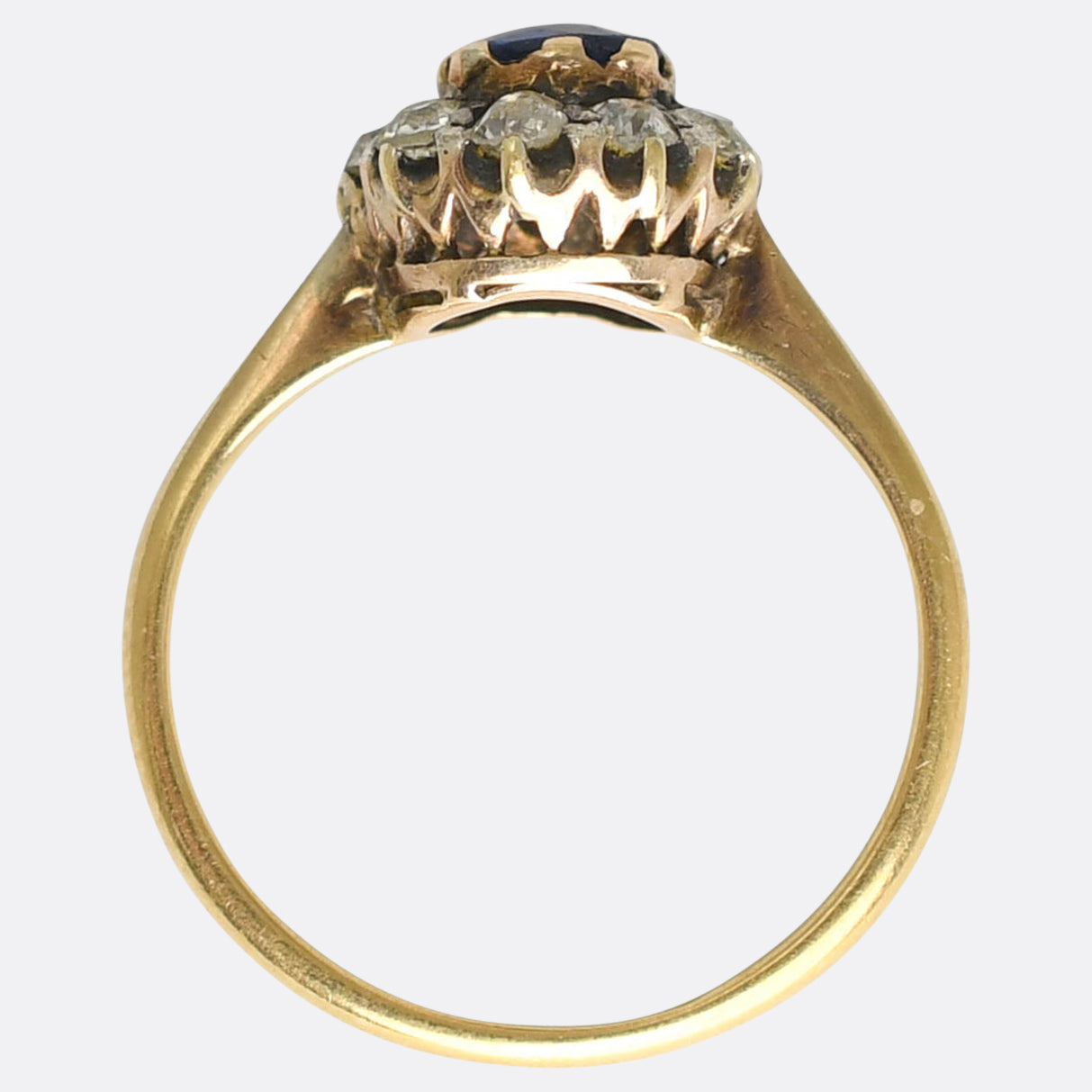 This charming late Victorian cluster ring features a gorgeously round head, set with a sapphire and old cut diamond cluster. The sapphire, 0.5 carats, displays velvety shades of dark and bright light blue throughout. Surrounding the centre stone is a sparkly cluster of old cut diamonds, with a pierced gallery and open backed settings. It features subtly pinched shoulders and a slim band, modelled in 18 karat gold. Dates to the turn of the century, circa 1900.
