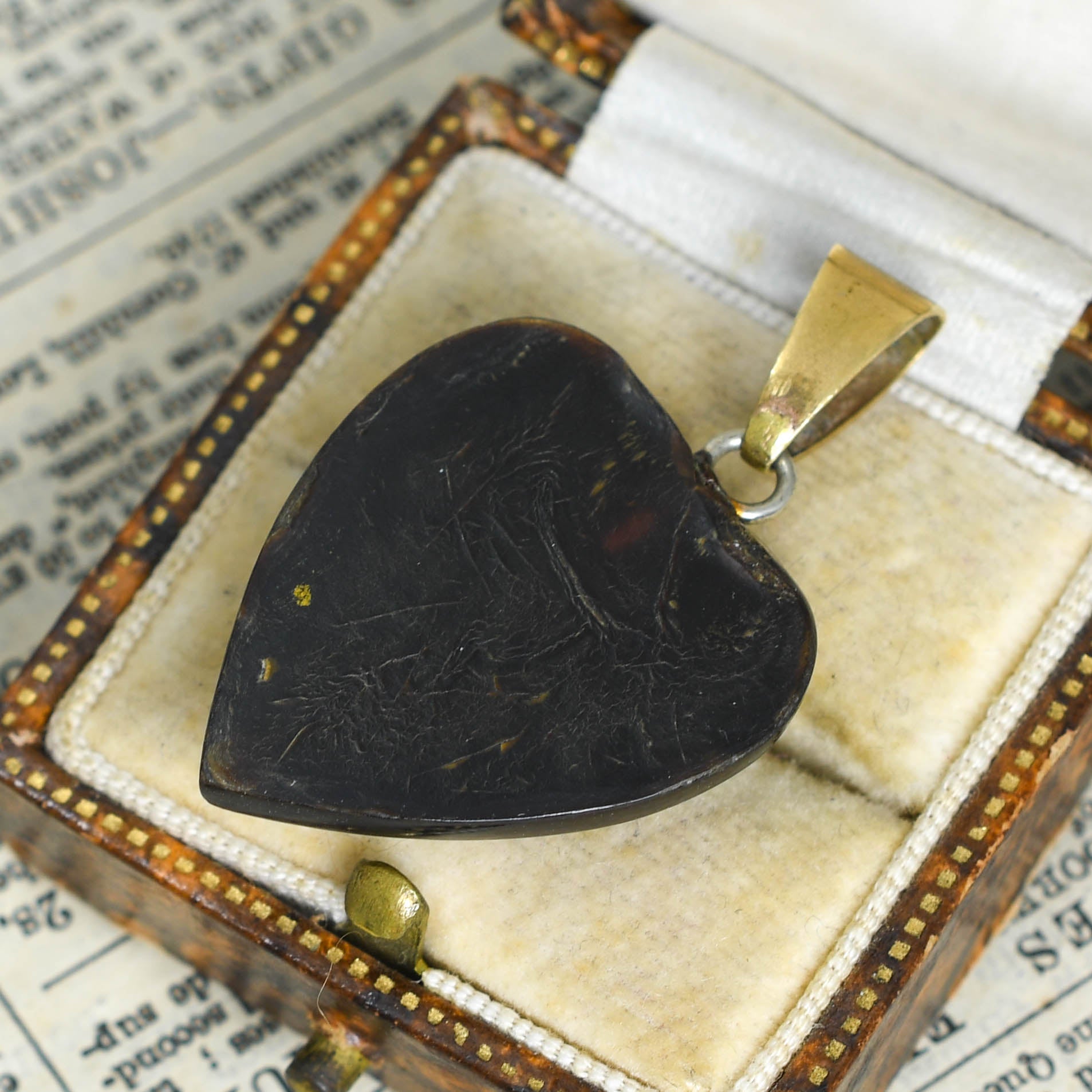 A lovely antique pique heart pendant dating from the mid Victorian period, circa 1860. The heart moulded shell has been expertly inlayed with a gold floral spray to the centre, with a fine gold border around the heart itself. Complete with an original bail for wear on a chain.