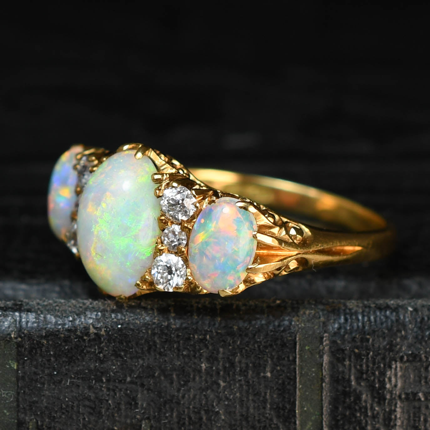 This super fierce Victorian ring is set with 1, 2, 3 dreamy opals, displaying hues of blue, green, yellow and orange, red and purple- they really seem to shimmer and glisten when moved on the finger! Set at either side of the the centre stone are three sparkling old cut diamonds, 0.26ct total. It features a lovely scrolled gallery that spills onto the shoulders, and its crafted in rich 18 karat gold throughout.