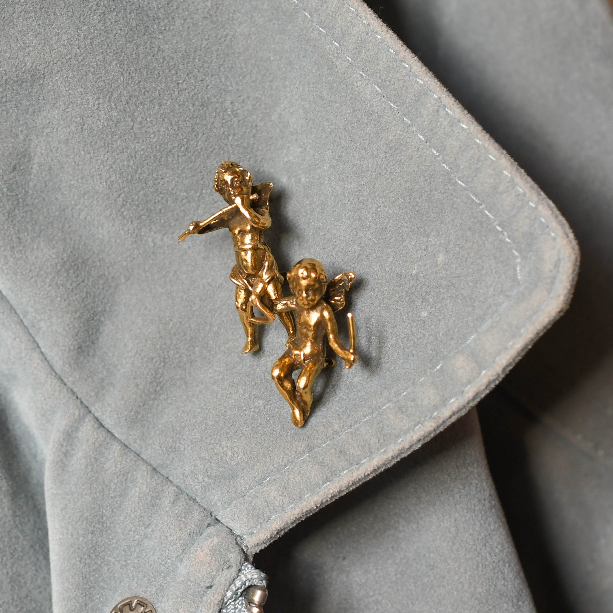This super charming Victorian brooch pair are modelled as two little cherubs, each one playing an instrument. They look great worn as a pair on your jacket collar, and they're modelled in brass throughout. Known as Putti or Putto, the cherubs are very common as angels making music, as instruments of profane love- its like their own little orchestra! They are each shown playing their own instrument, the triangle and the flute- symbolizing heavenly joy, innocence and divine harmony.