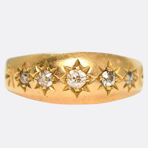 Beautifully worked, carved half-hoop ring with intricate scrolled engraving to the gallery and shoulders, and home to five old mine cut diamonds (approx. 2ct total). The stones are bright and sparkly, a great style for an engagement ring or wedding band. It dates from the Victorian period, circa 1880 and is crafted in 18k yellow gold.