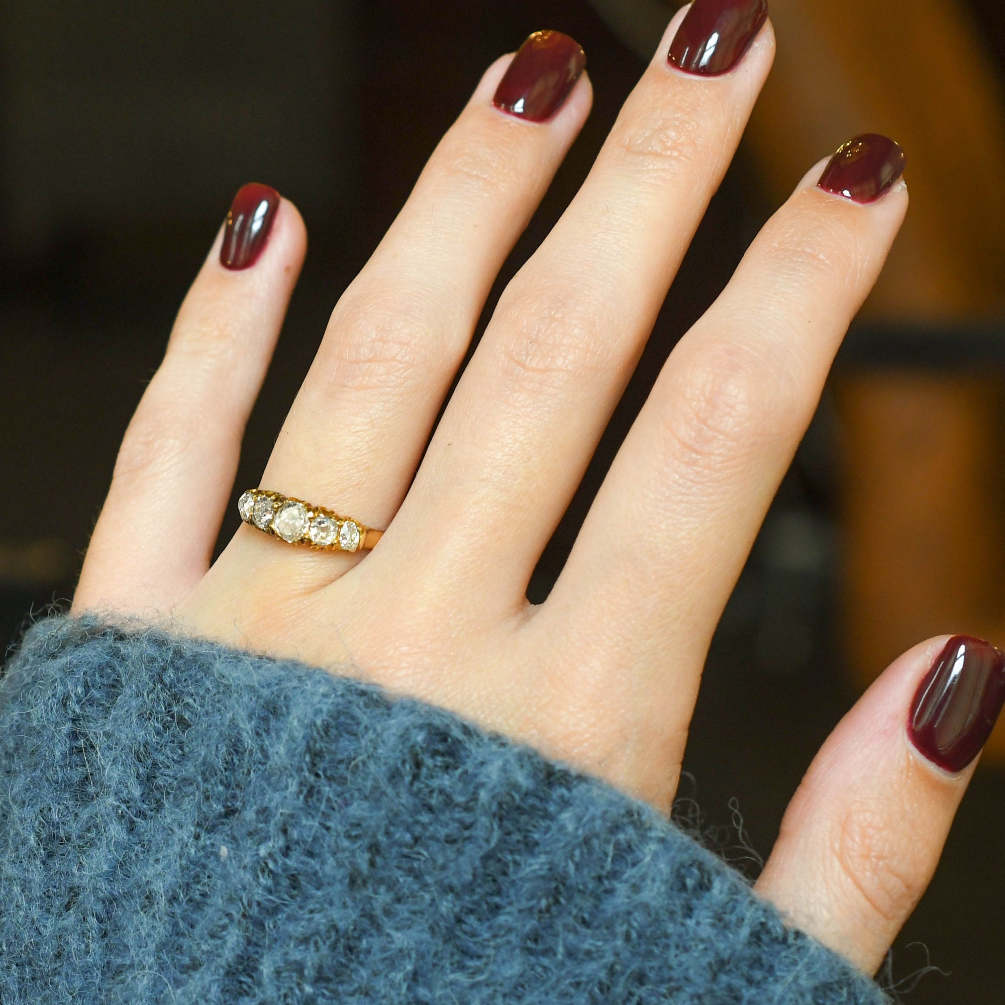 A charming Victorian 5 stone ring, with English hallmarks dating it to Birmingham and the year 1877. Modelled in 18 karat yellow gold throughout, it features five gorgeous hand cut old diamonds, 1.02 carats total, graduating across the head. They rest in semi-scalloped claw settings, allowing the light to shine through the stones. The band is slim an it rests beautifully against the finger.