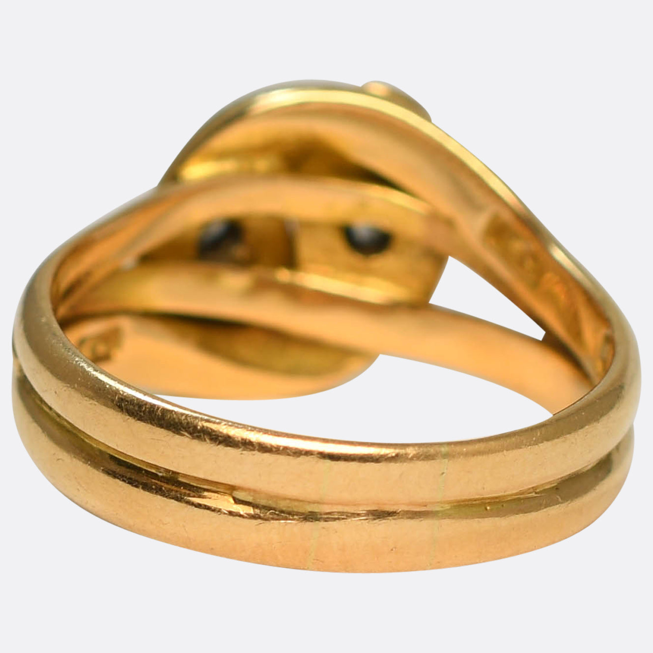 This gorgeous snake ring is crafted in 18 karat gold, with English hallmarks for London assay office and the year 1895. Its modelled as two charming snakes, intertwined at the head and each one set with old cut diamond "brains". The shoulders are split into three, displaying the snake bodies and tails.