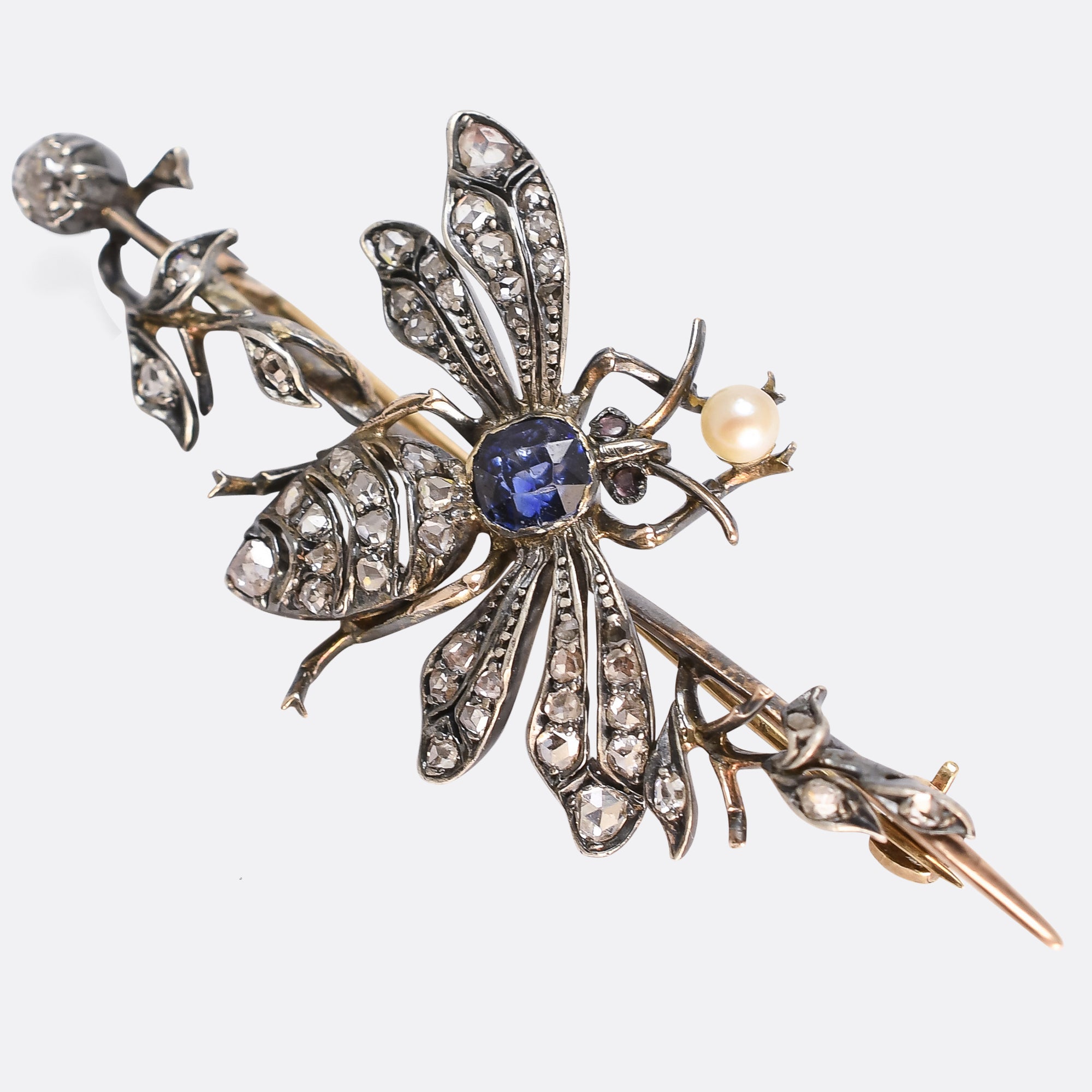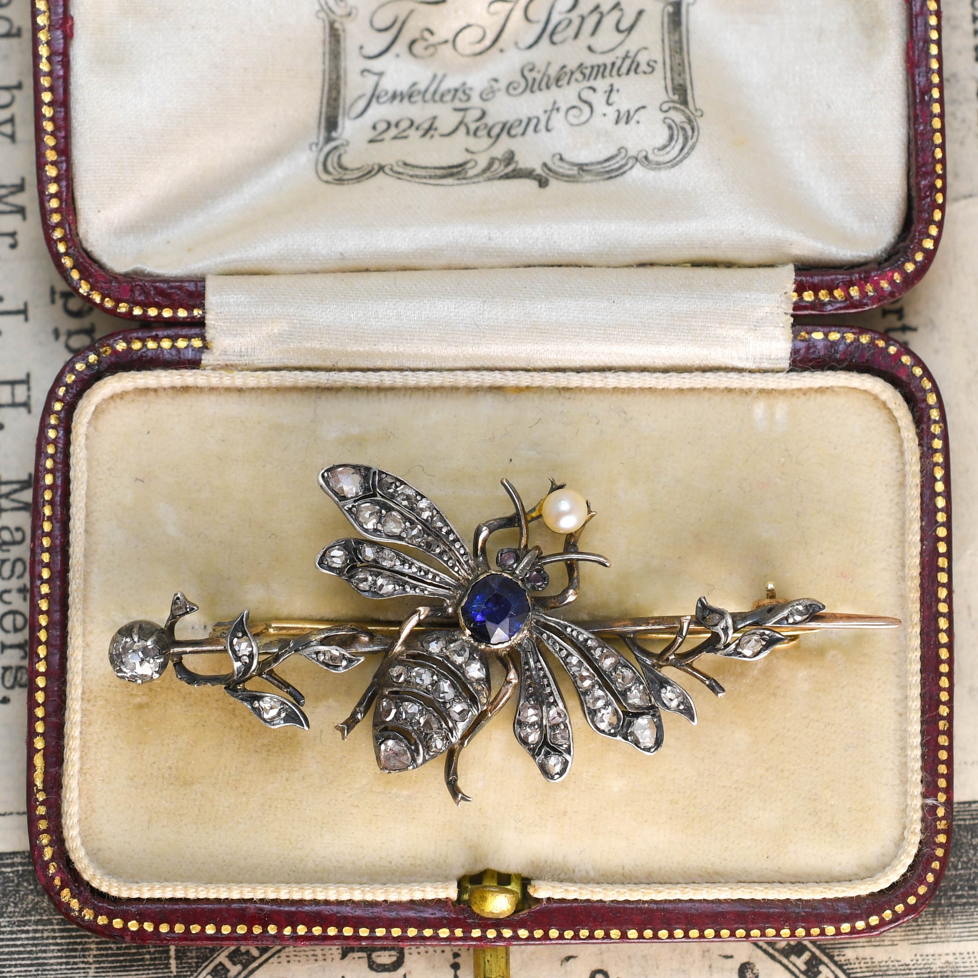 This gorgeous antique brooch is set with old and rose cut diamonds, pearl and a natural blue sapphire which takes centre stage. The sapphire displays a gorgeous deep blue, while the surrounding rose cuts glisten softly in the wings and body of the insect. A small natural pearl sits at the top of this gorgeous bug, with fine silver work for legs and antenna. Elegant old and rose cut diamond set flower motifs wrap around the bar of the brooch, giving a real sense of movement and sparkle. The stones rest in silver while the back and pin are crated in 15k yellow gold.
