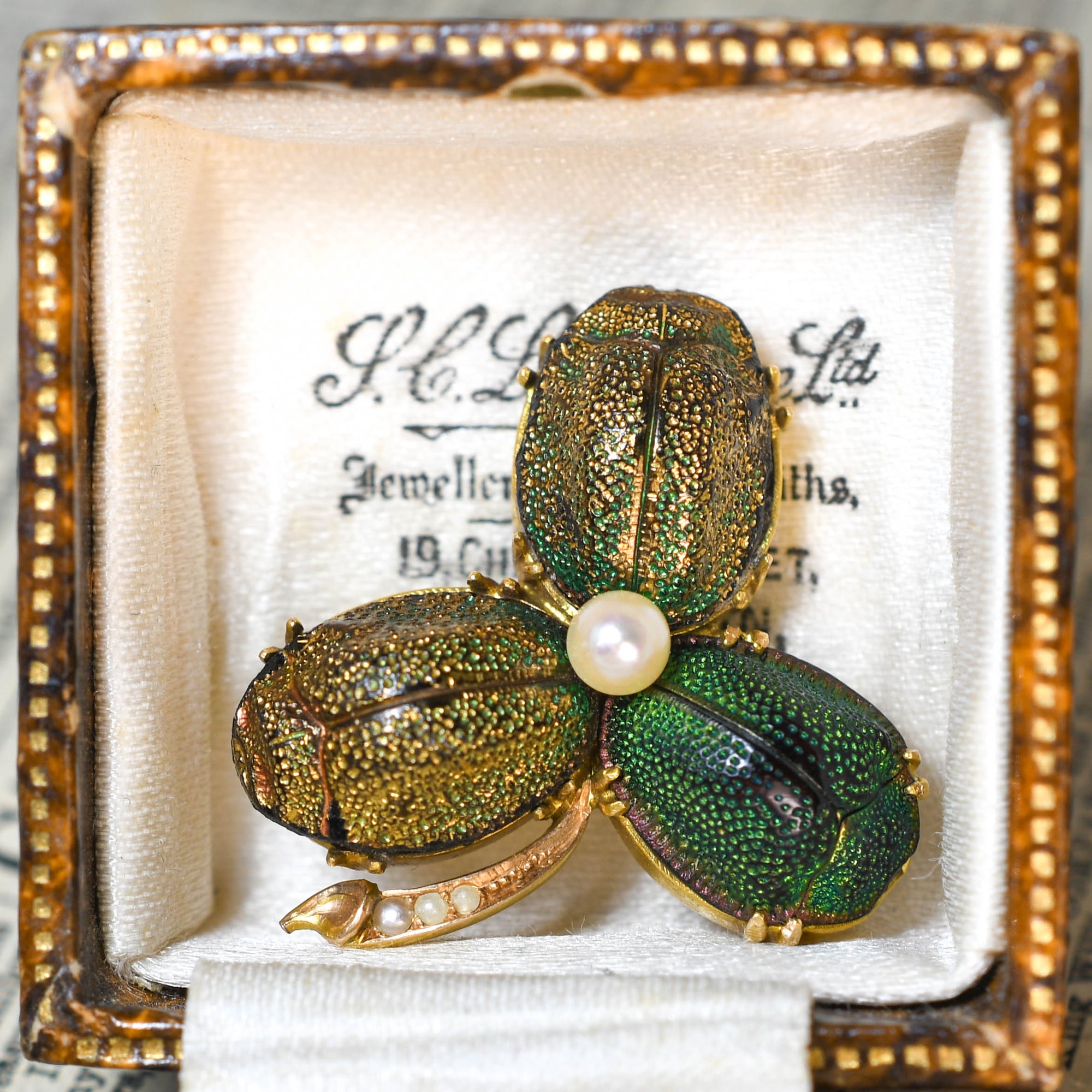 This charming antique Egyptian Revival scarab brooch is modelled as the lucky clover. Crafted in 15k gold throughout, the piece is finished with gorgeous pearl details, and the scarabs display that charming shimmering green colour. We love this worn as a brooch, of course, but it would look even better on a chain!