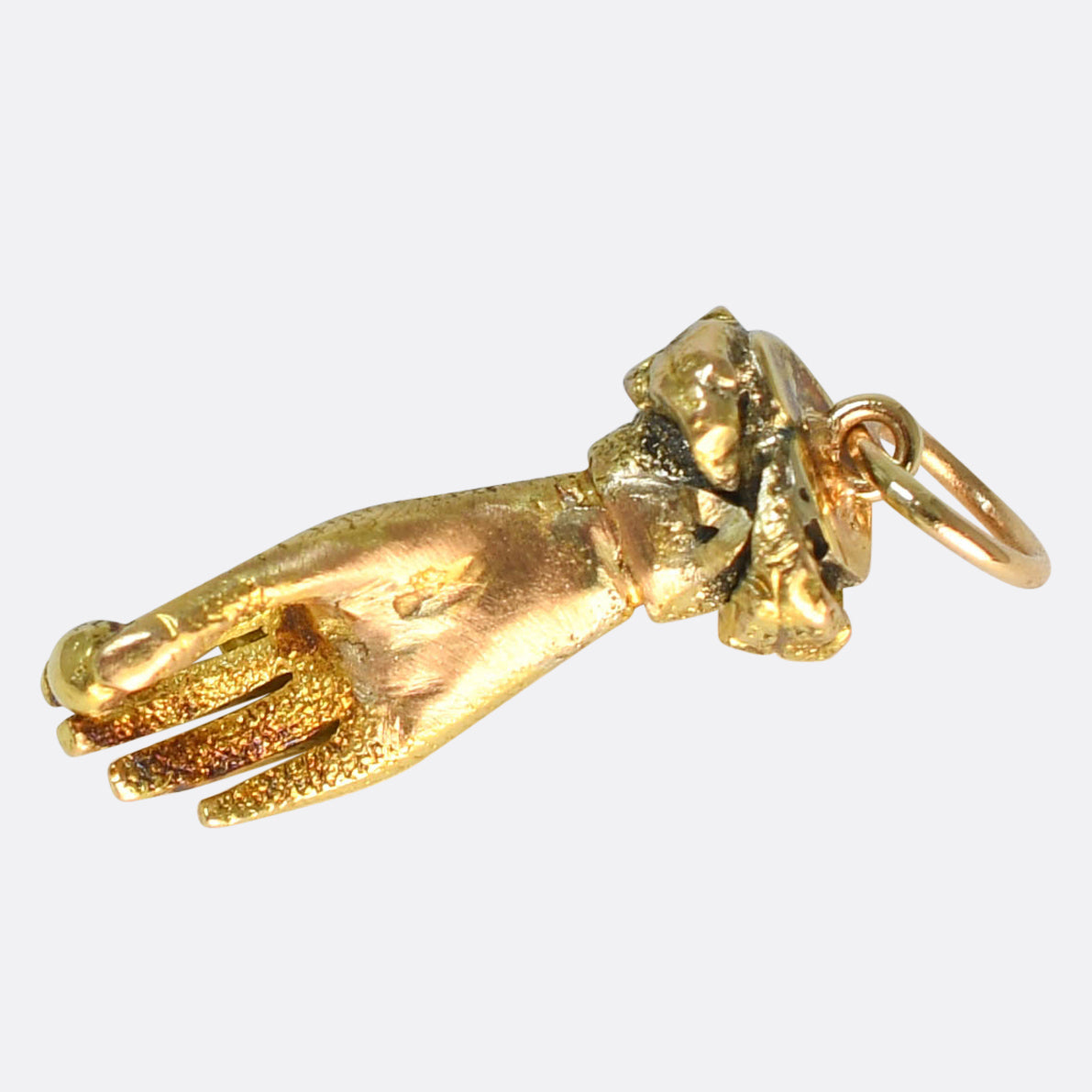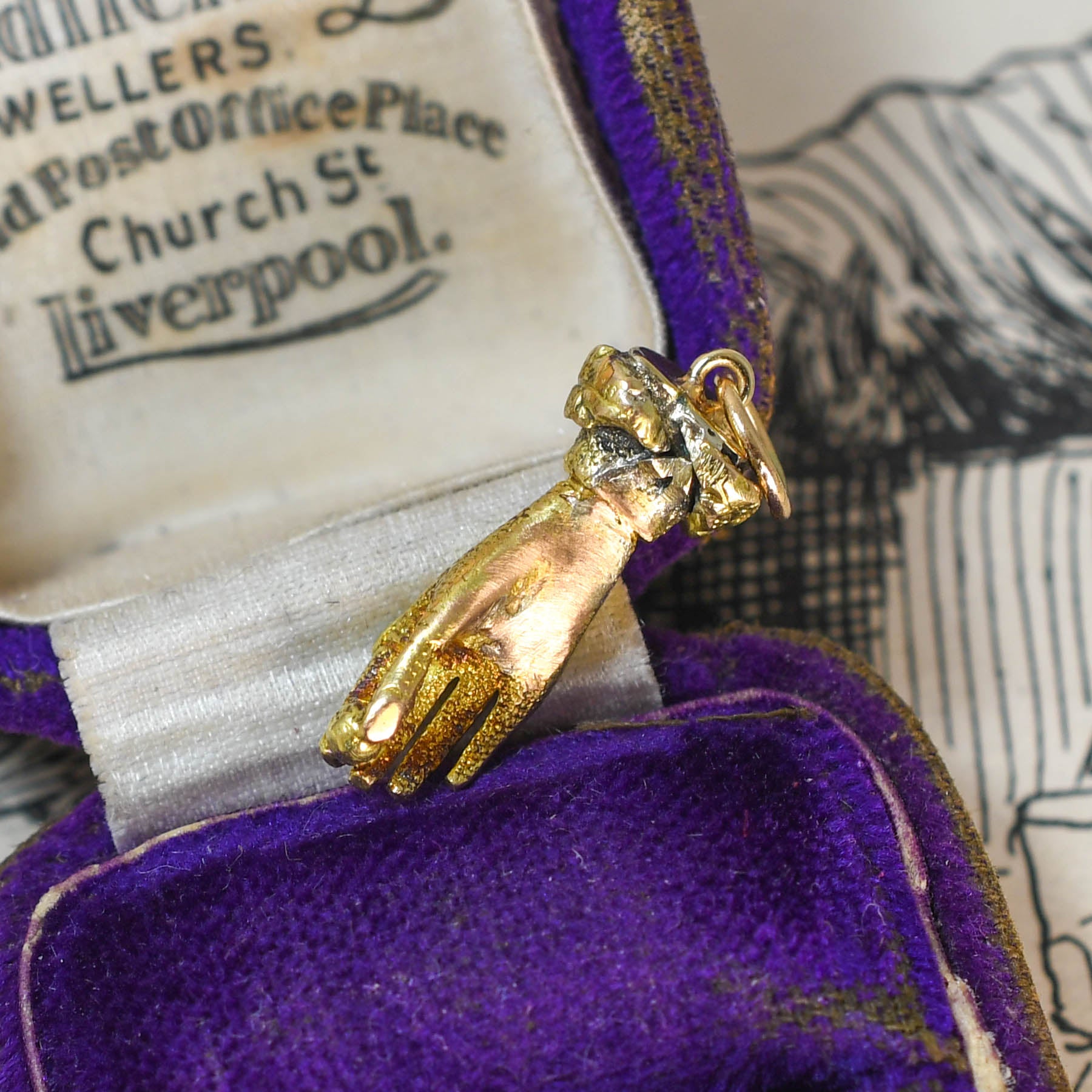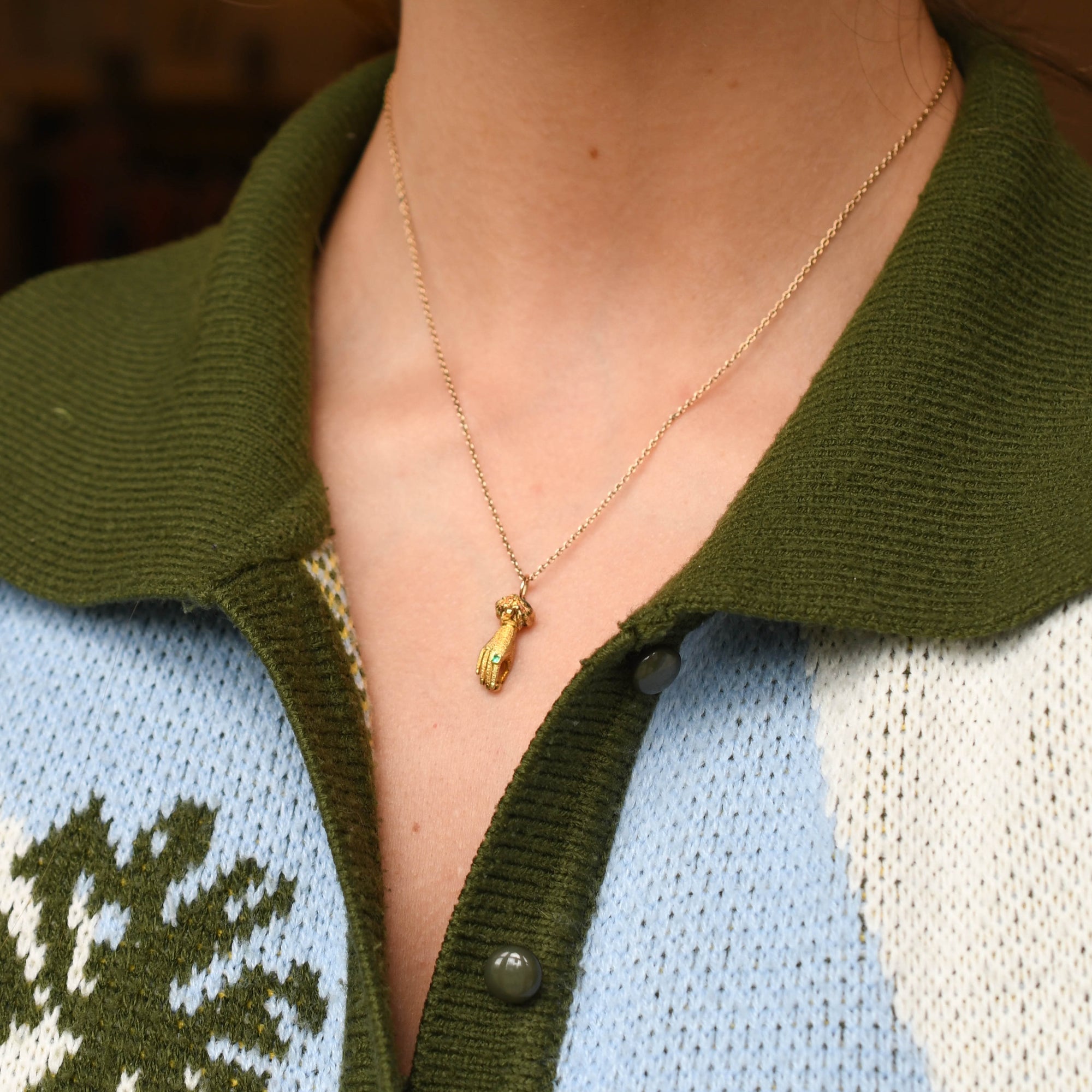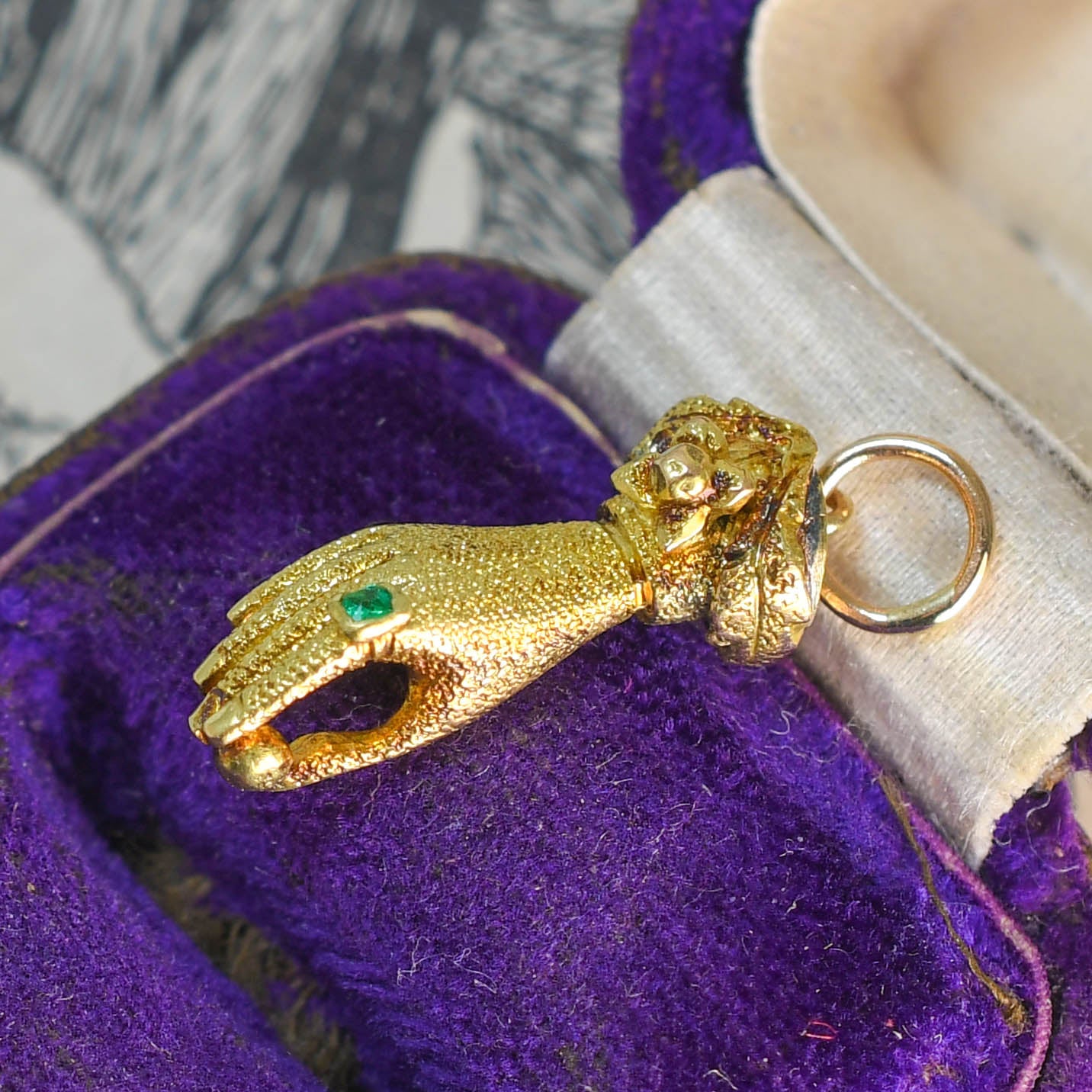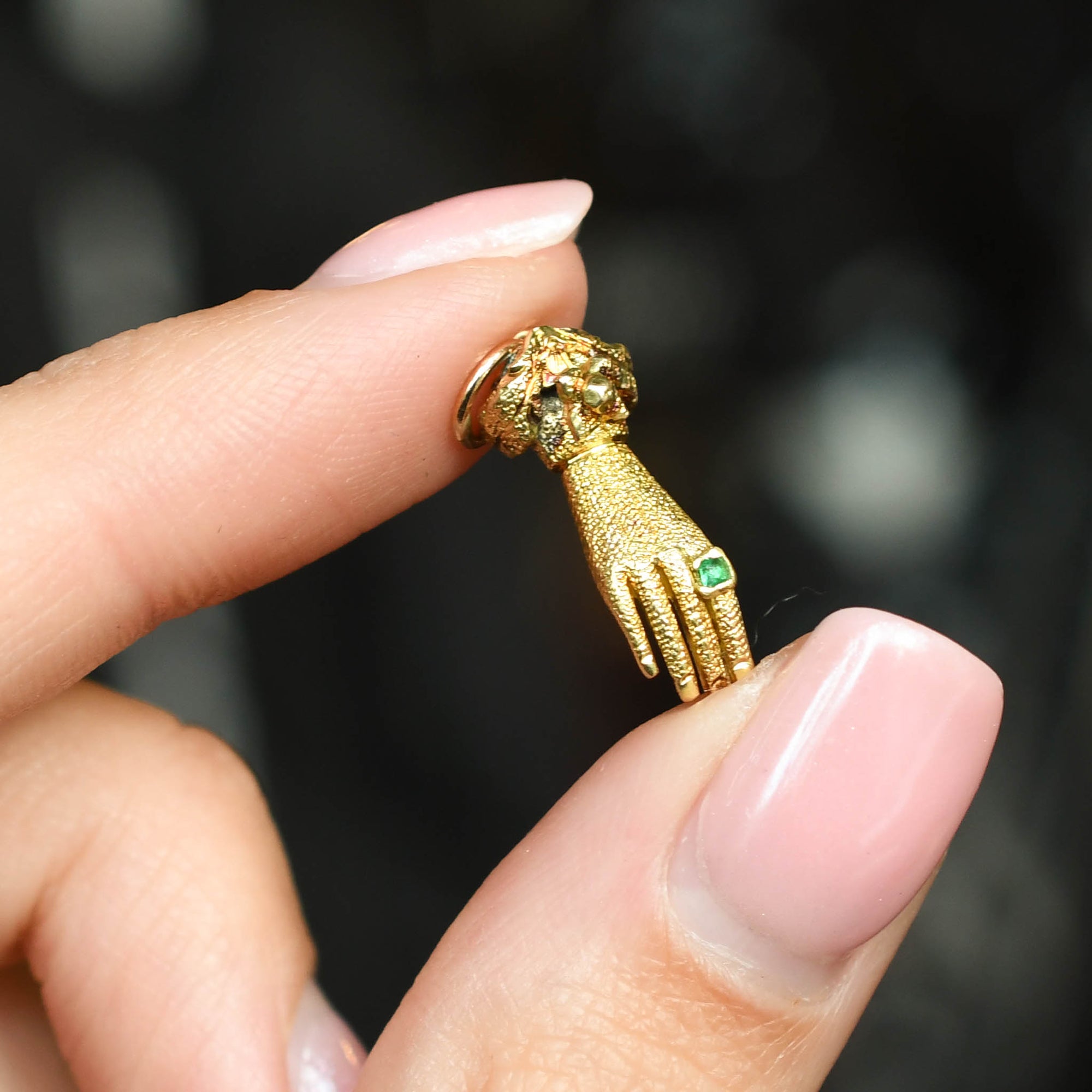 This stunning little Georgian charm is modelled as a hand, complete with its own "emerald ring"! Crafted in 15k gold throughout, the hand its beautifully textured throughout with a floral cuff at the top that meets the gold jump ring. The juicy emerald is perfectly placed across the pointer finger, whilst the hand holds a small gold ball- a lovely symbol of friendship - holding onto something forever... I expect an old conversion from a clasp .