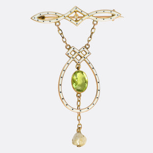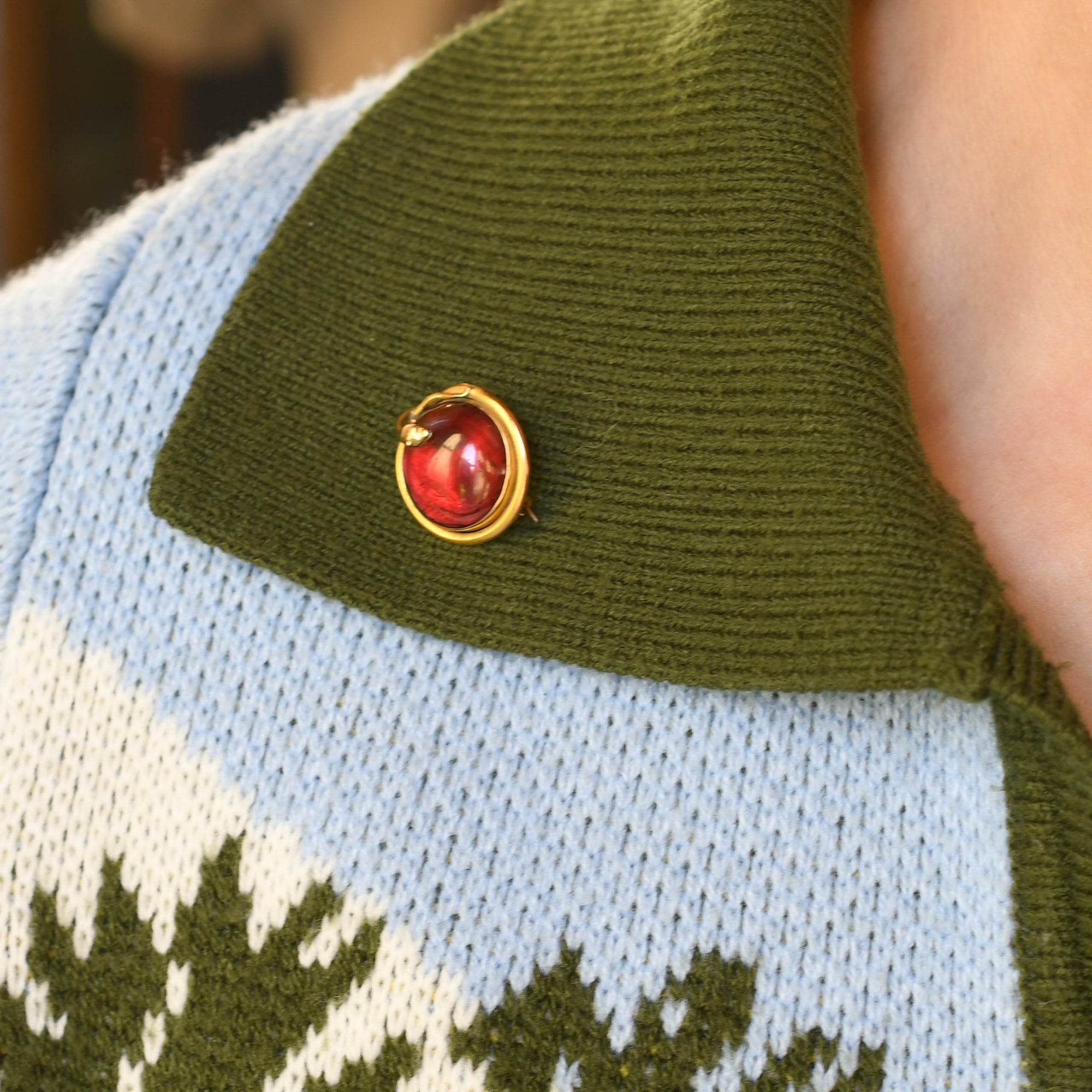 A large, juicy garnet cabochon is the main event of this cool antique brooch. The stone displays a deep hue, with flashes of lighter red when moved in the light. A gold snakes head and tail meet at the side of the garnet, creating an eternal loop that wraps around the entire piece, with a locket compartment to the back. Modelled in 15 karat yellow gold, it dates from the Victorian period and can be worn with the brooch fittings, or even hung from a chain.