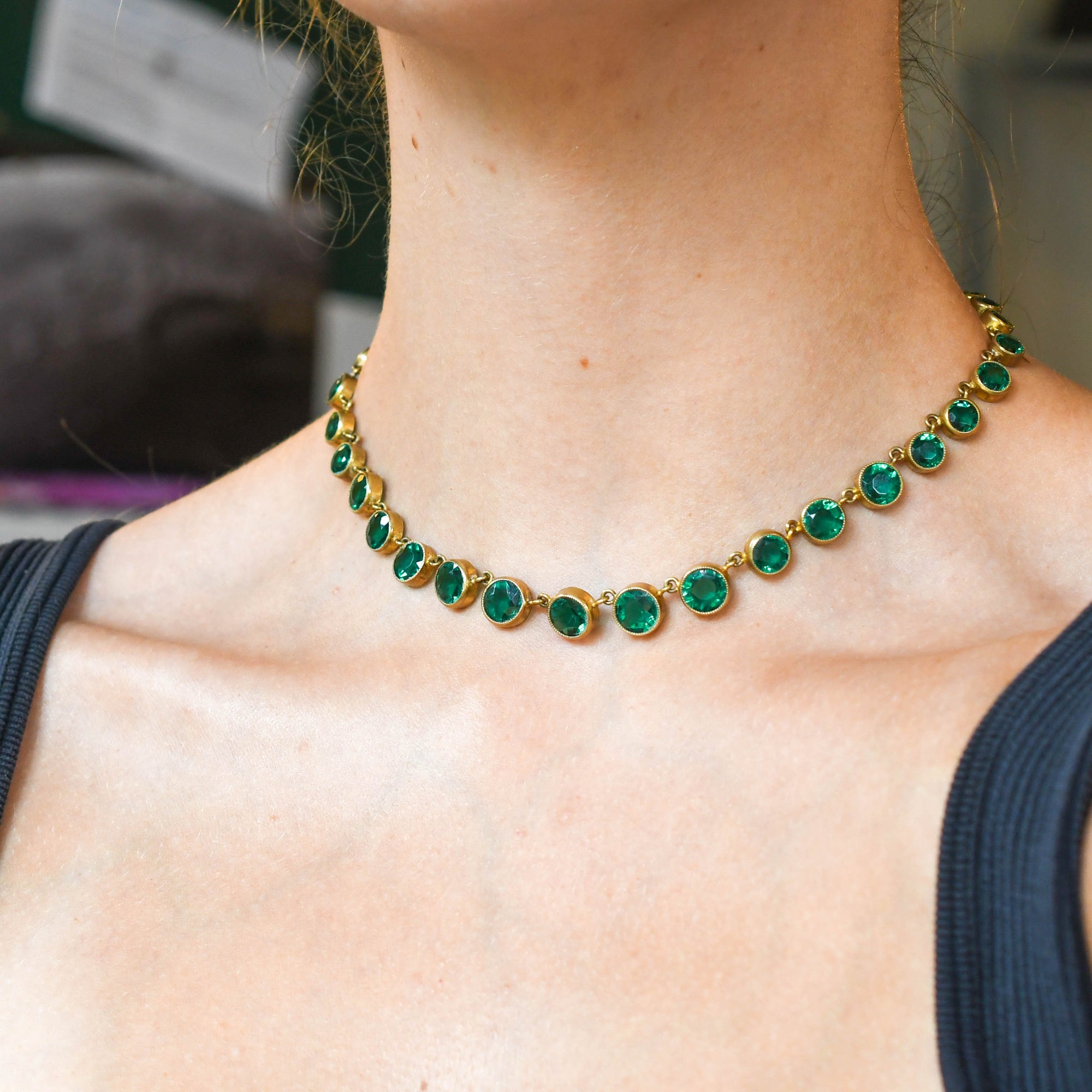This charming Victorian rivière necklace is set with gorgeous green paste stones, graduating in size across a chunky yellow chain. Each paste stone is bezel set and bordered with fine pretty detailing, while each one displays an intense green colour with the light shining through the back of them. It fastens with a barrel clasp and has a wearable length of 15 inches- perfect to style as a choker or in a layered chain stack!