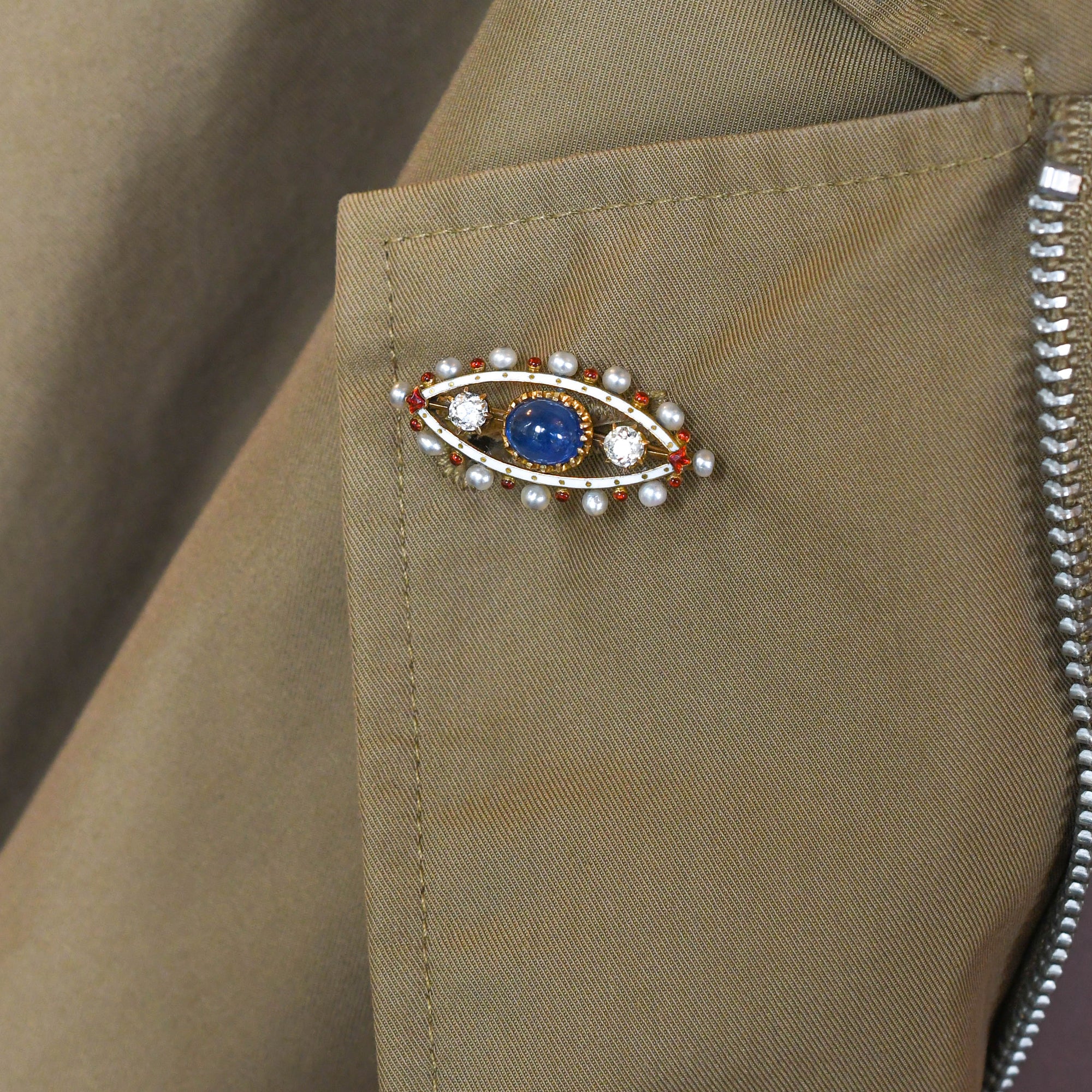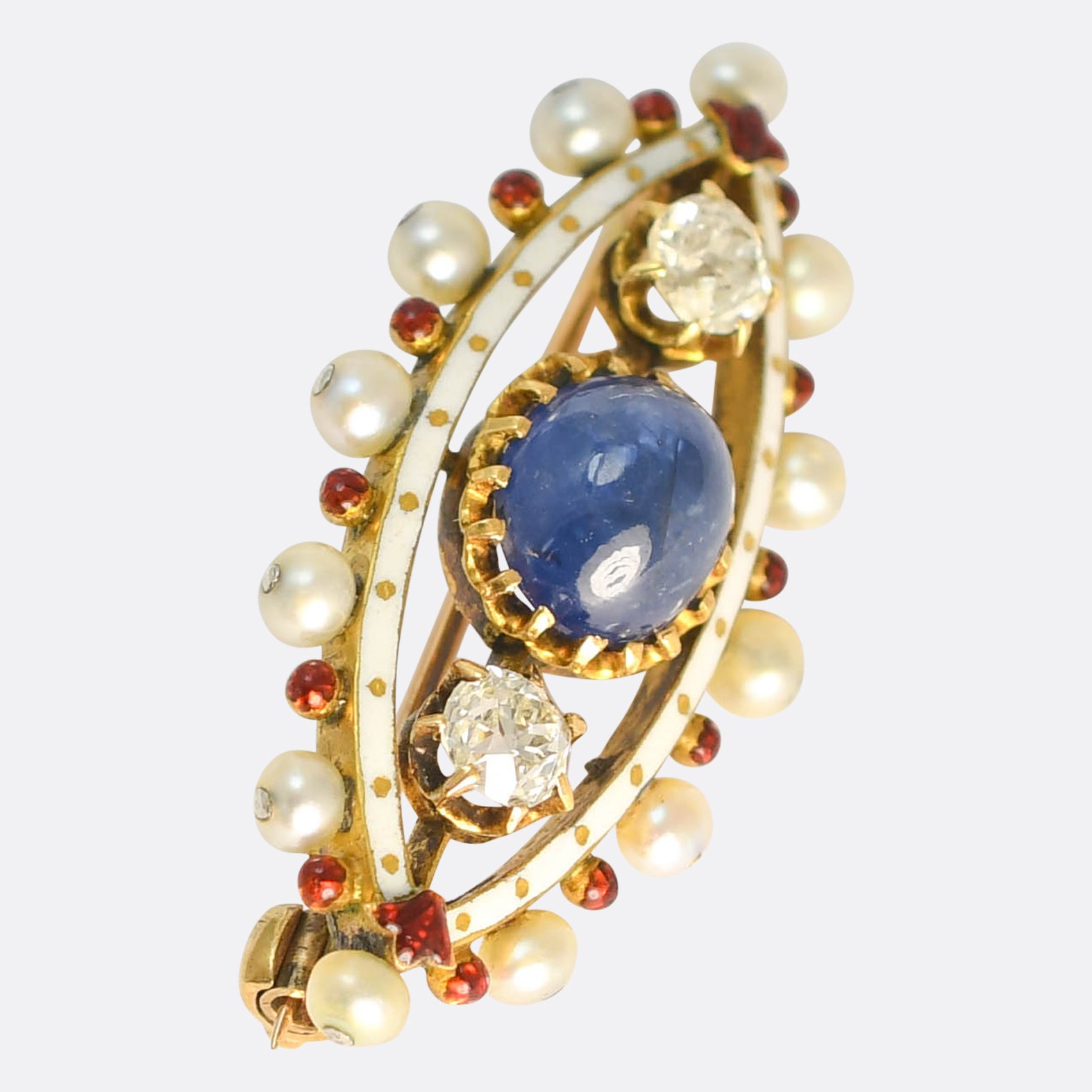 This unusual antique multi-gem brooch dates from the Victorian period, circa 1870. It almost reminds me of the "evil eye" symbol, with the centre sapphire cabochon surrounded by the oval shaped halo border. The stone is flanked by two old mine cuts, 0.54ct total, and the halo is finished in fantastic white and gold polka dot enamel. Pearls and red enamel (that almost look like gems!) alternate around the shape, and its modelled in 15 karat gold throughout.