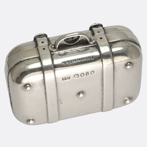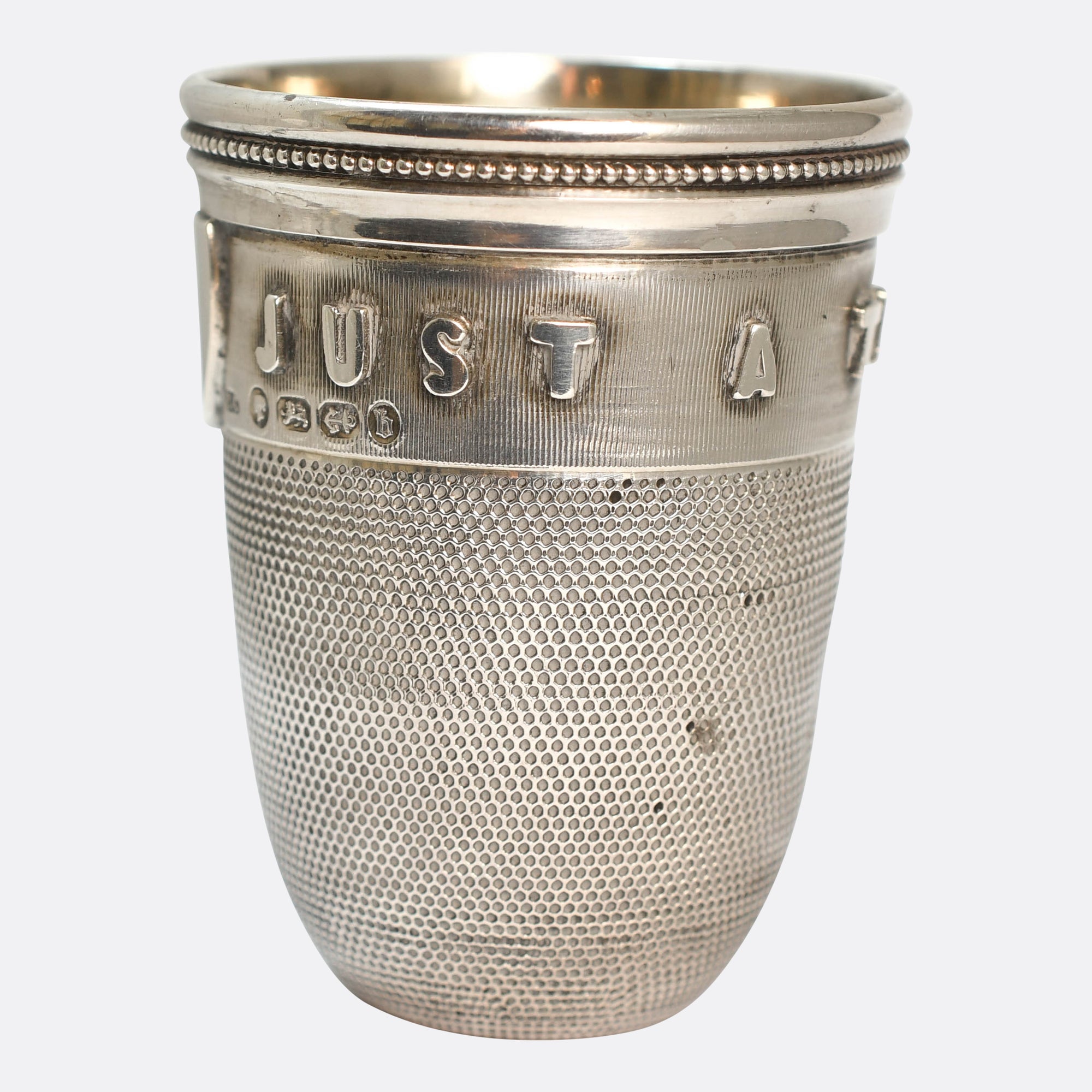 This cool Victorian novelty shot glass is modelled as an oversized thimble. Modelled in sterling silver throughout, it features the well known saying "Just A Thimbleful" applied across the top, along with the English hallmarks dating it to Birmingham and the year 1876. Its definitely not lost "a single drop" of humour over the years, remaining in lovely antique condition.