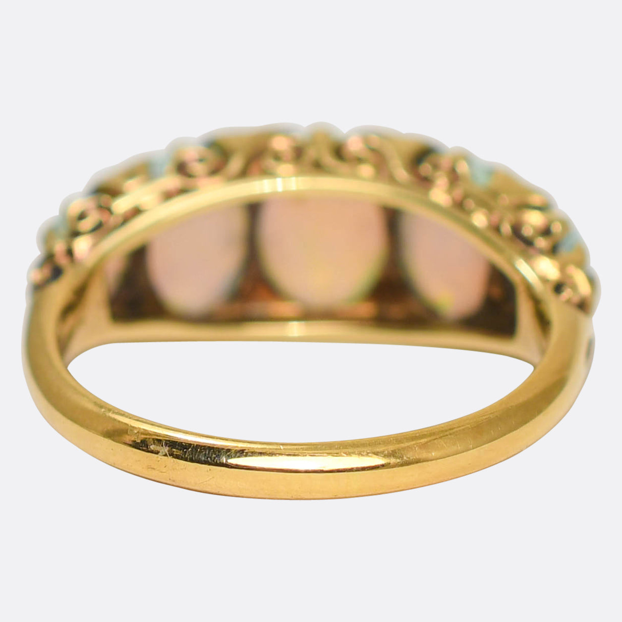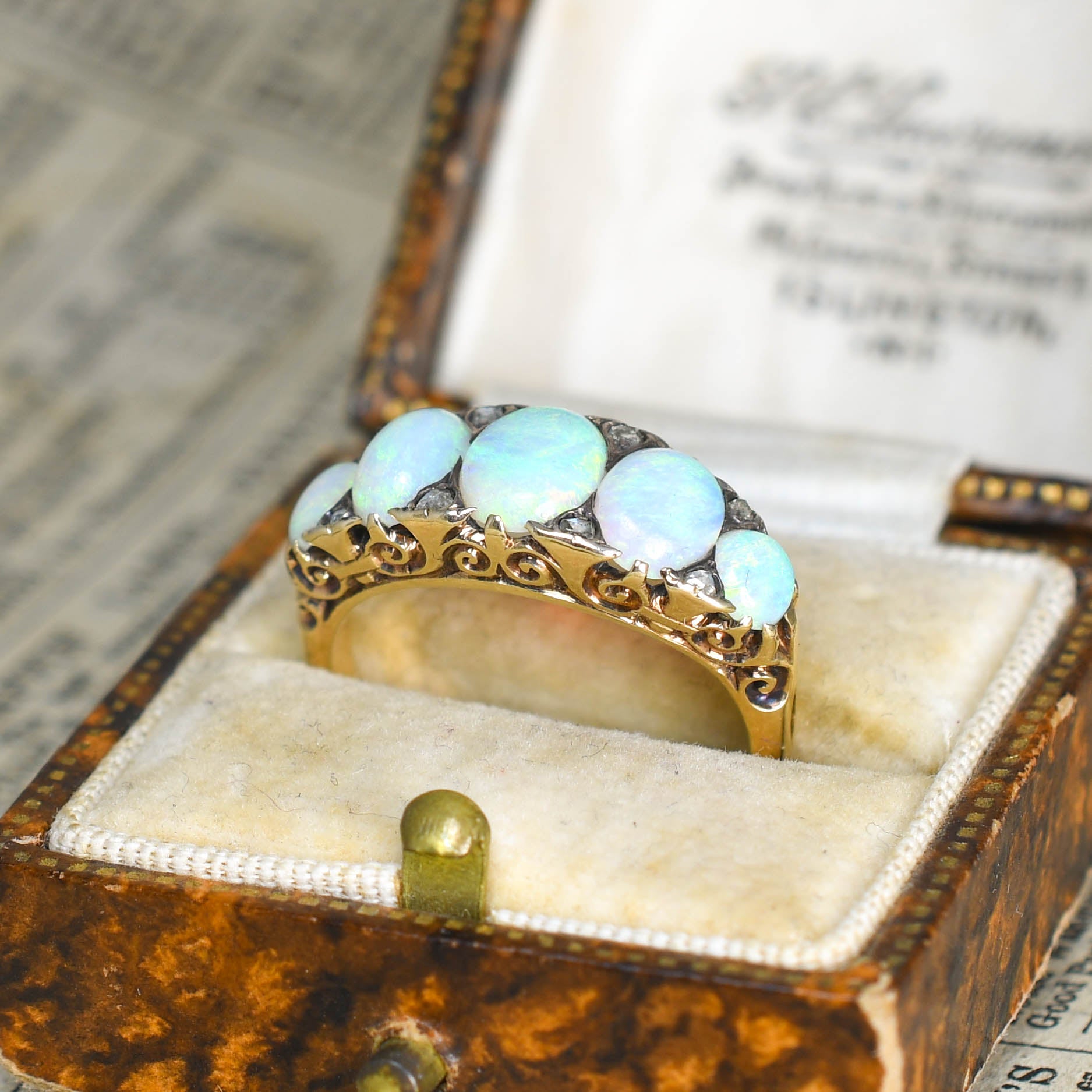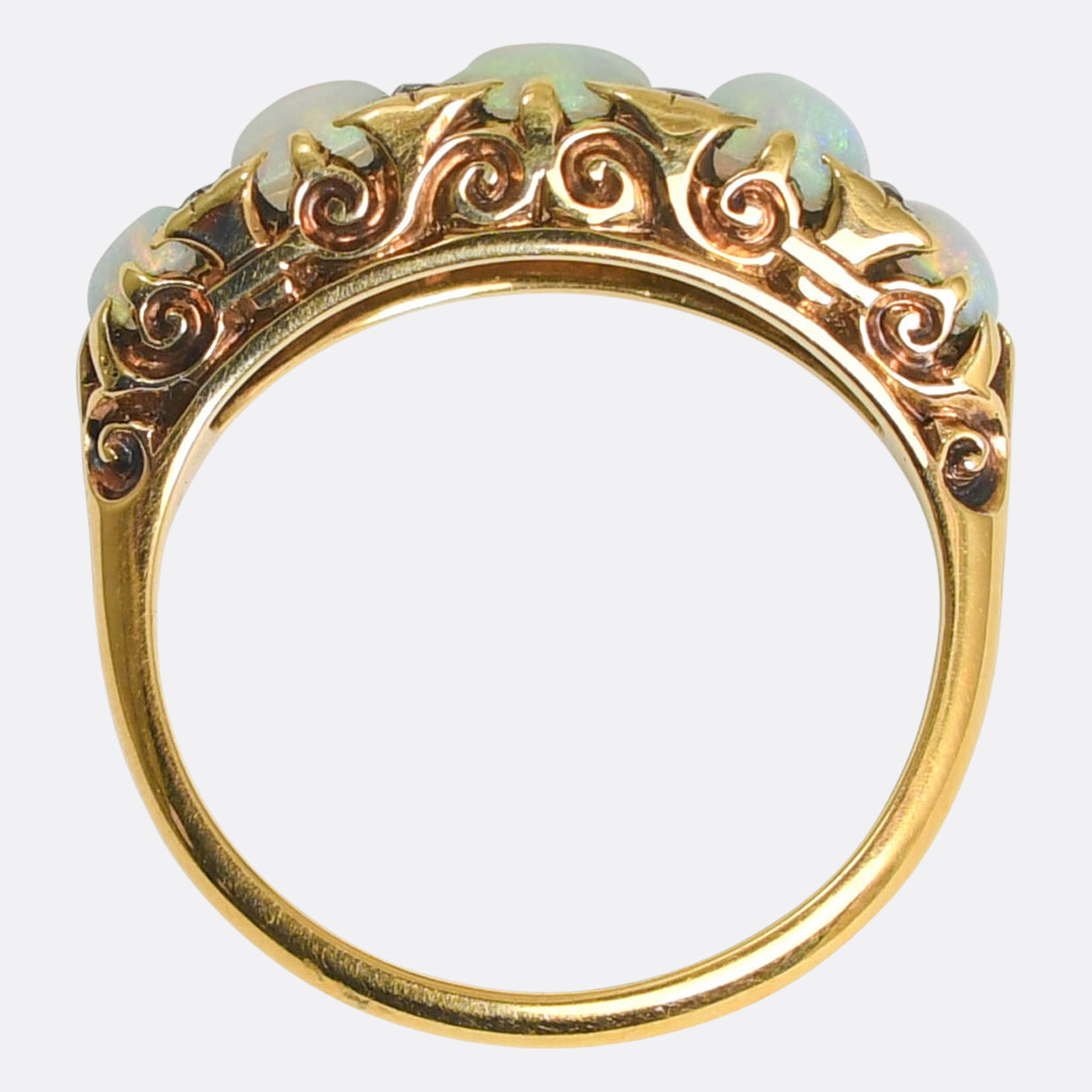 A lovely Victorian period half hoop ring set with five fiery opal cabochons. The stones graduate in size across the head, each one displaying a vivid blue colour with specks of orange, red, yellow and green throughout. In-between each stone rests a pair of rose cut diamonds, and the stones are set by the gorgeously scroll carved gallery that travel up to reach the stones and hold them in place. Modelled in 18 karat gold throughout.