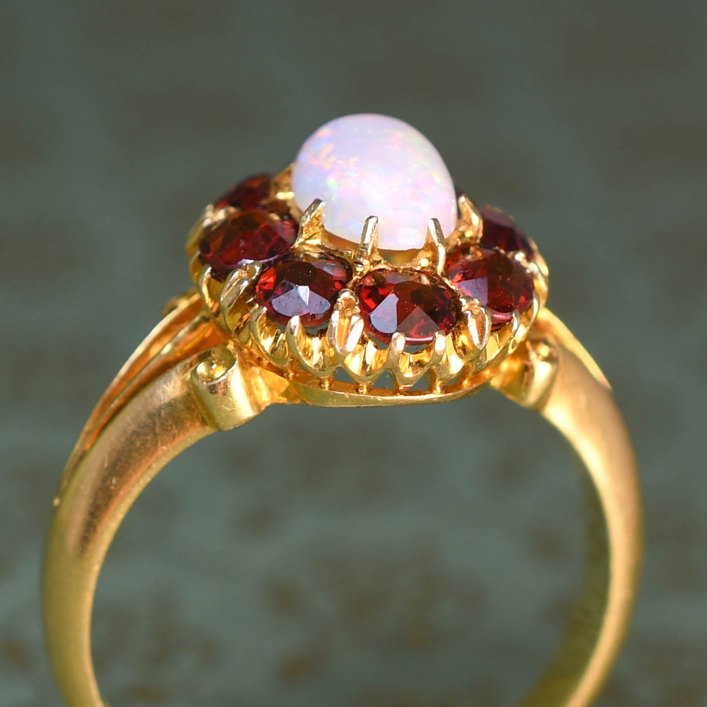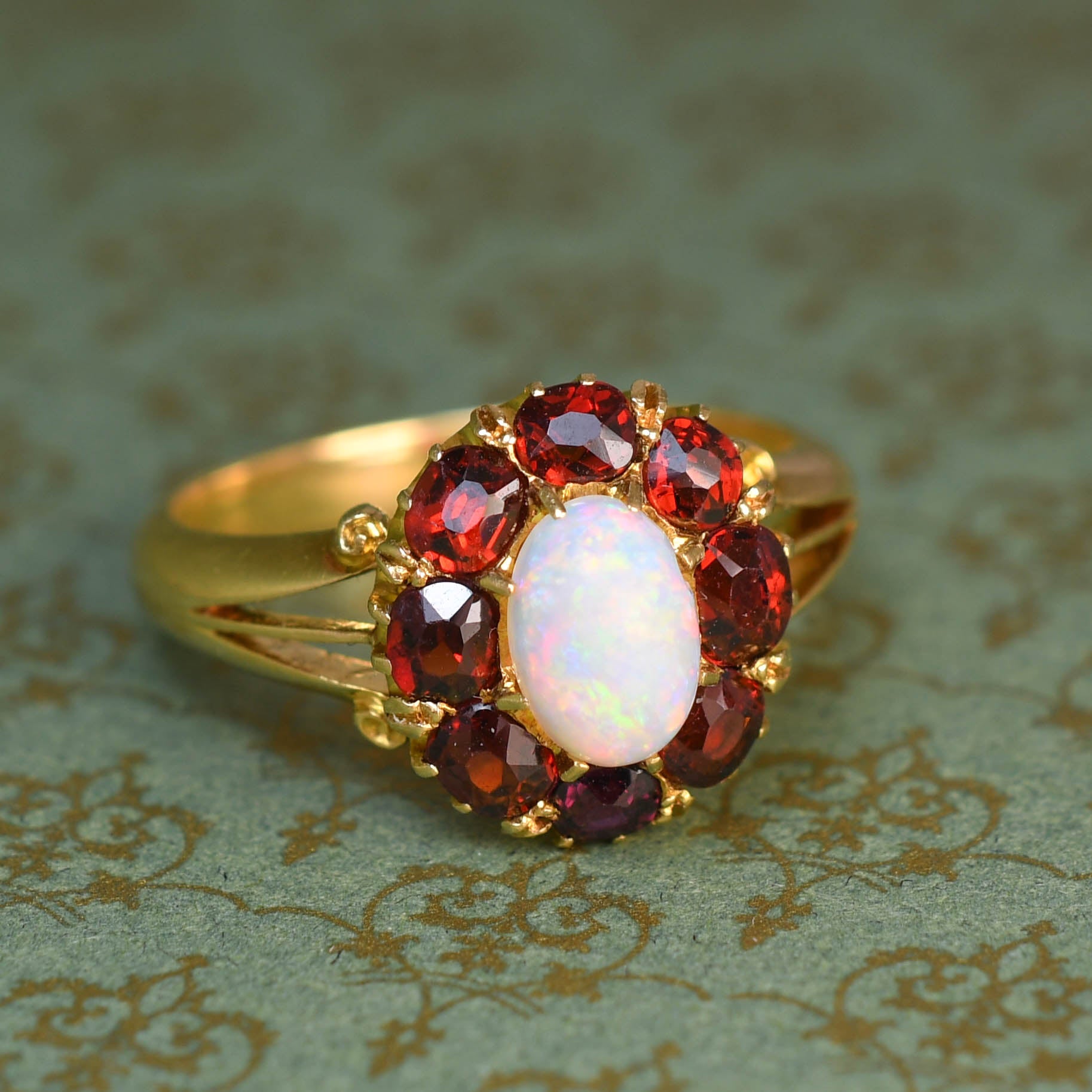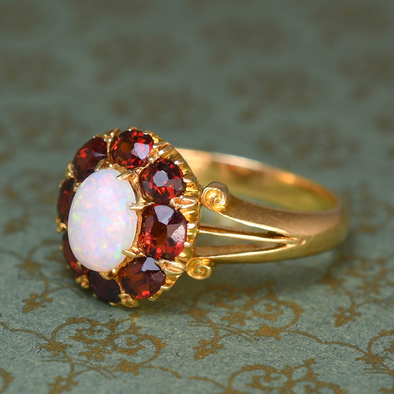 This amazing antique cluster ring is set with a fiery opal centre with a juicy ruby surround. Crafted in 18 karat gold throughout, it features split shoulder details and a lovely pierced gallery. The centre stone displays an array of colours from blue, green, red, orange, yellow and pink- and the rubies are super sparkly ad well saturated. It remains in gorgeous antique condition, and it rests beautifully worn against the finger.