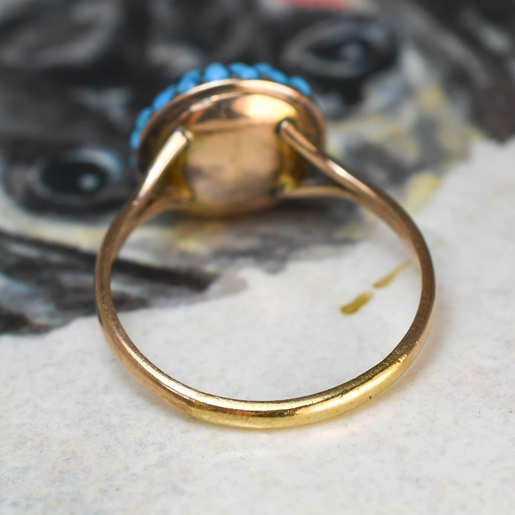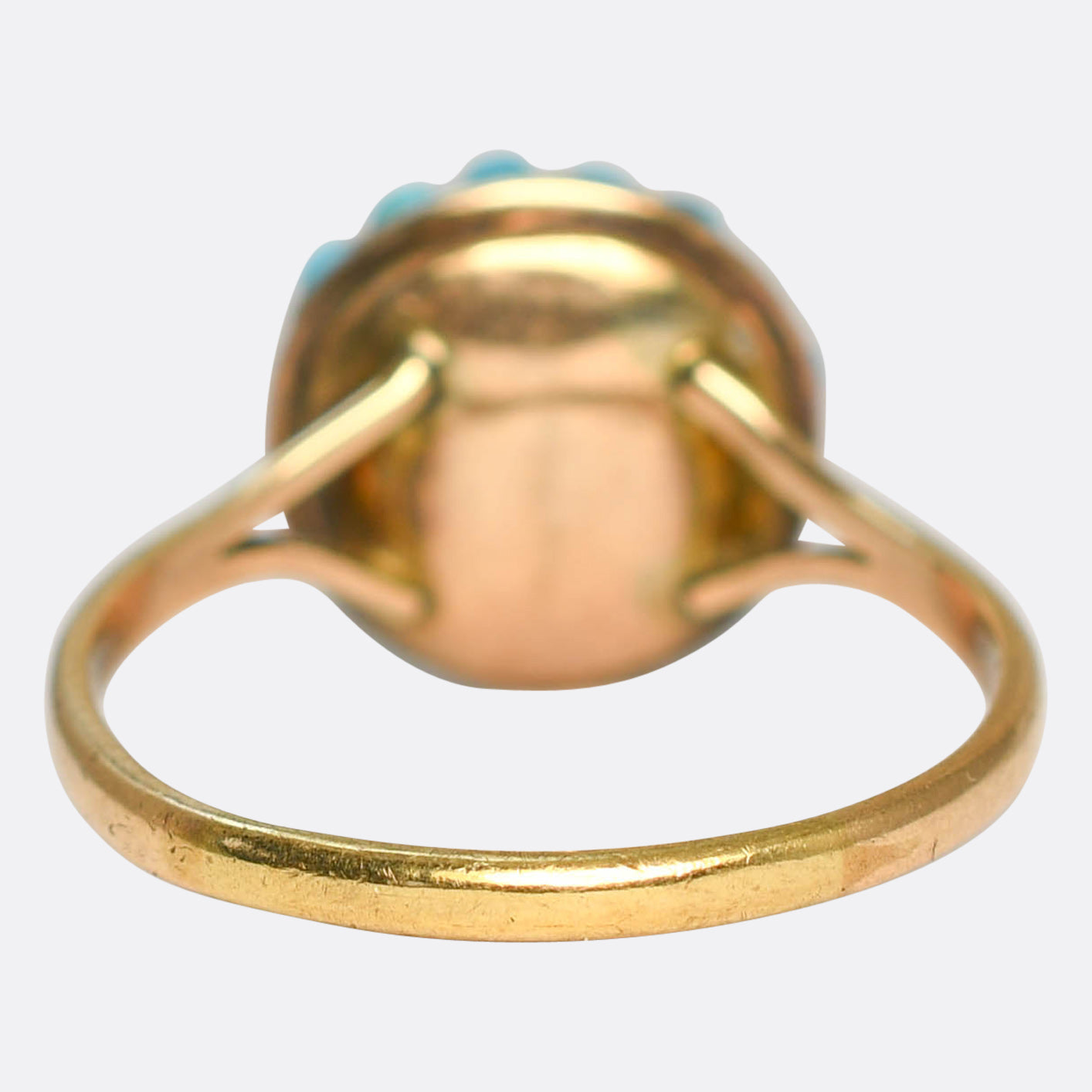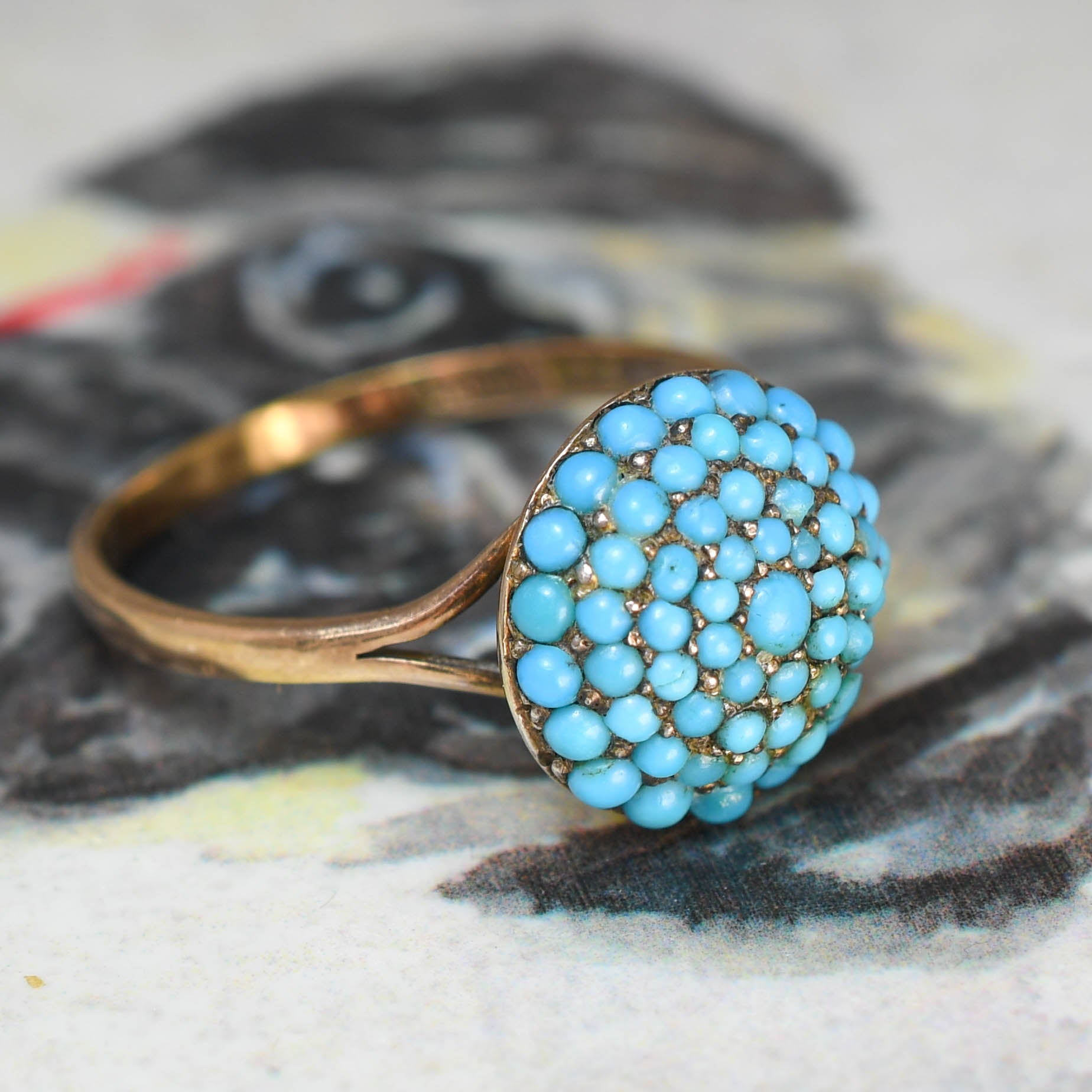The head of this colourful Victorian bombé ring is pavé set with gently graduated turquoise cabochons. They display a fantastic and vibrant colour, and they combine gorgeously with the yellow gold band. Its crafted in 9k gold throughout, with lovely split shoulder details and slim band.
