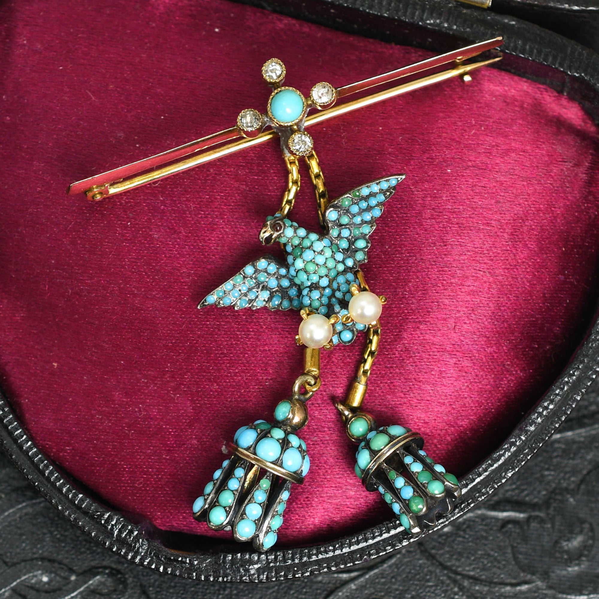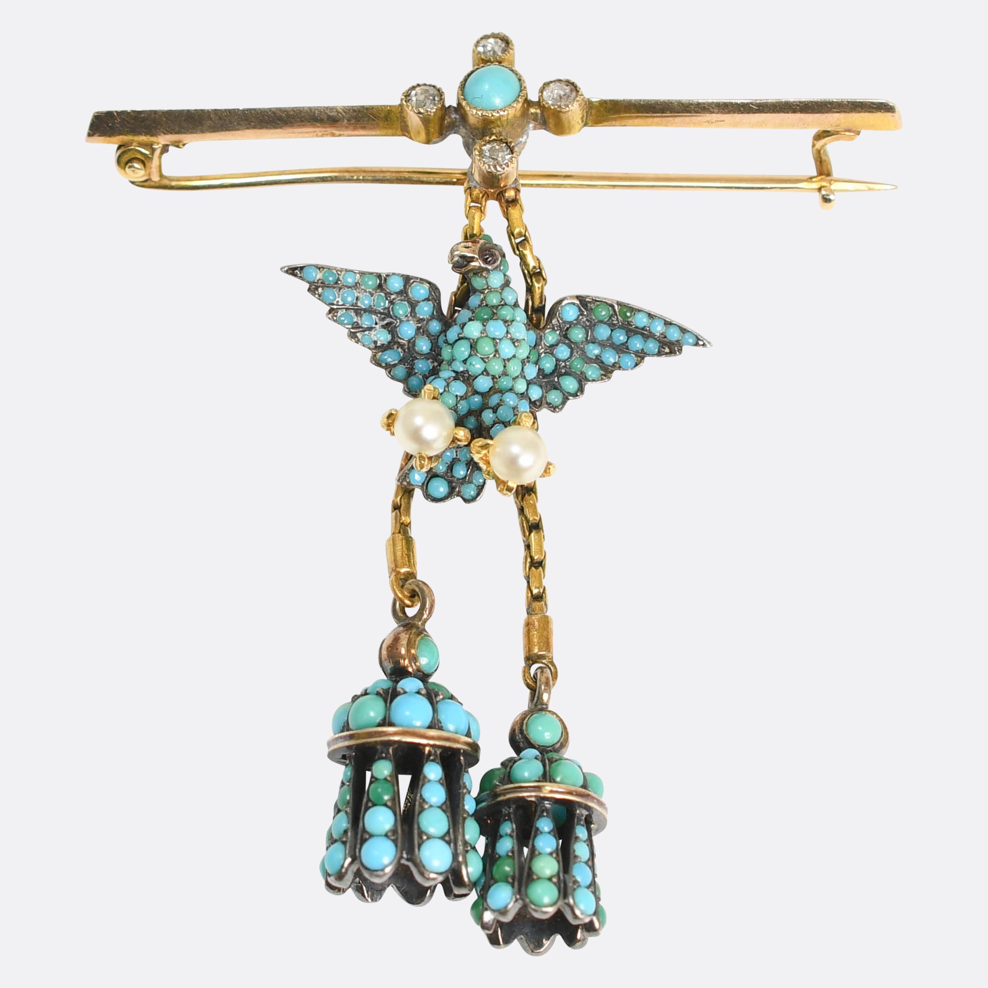 A fantastic Mid-Victorian era brooch, set with turquoise cabochons, pearls, old cut diamonds and ruby cabochons. The main event, a fierce eagle bird hanging freely from a diamond and turquoise cluster top, set across the knife-edge bar brooch. The eagle is pavé set with vibrant turquoise stones- its wings spread out and its claws grasping onto two dreamy pearls. Eagles can be seen to symbolize strength, power and leadership, whilst the pearls suggests its possess something pure and valuable, as it holds onto them. Below, suspending from fine gold chains are two charming turquoise set tassels. Its modelled in 15k gold with silver settings, and makes a powerful statement on your jacket/collar.