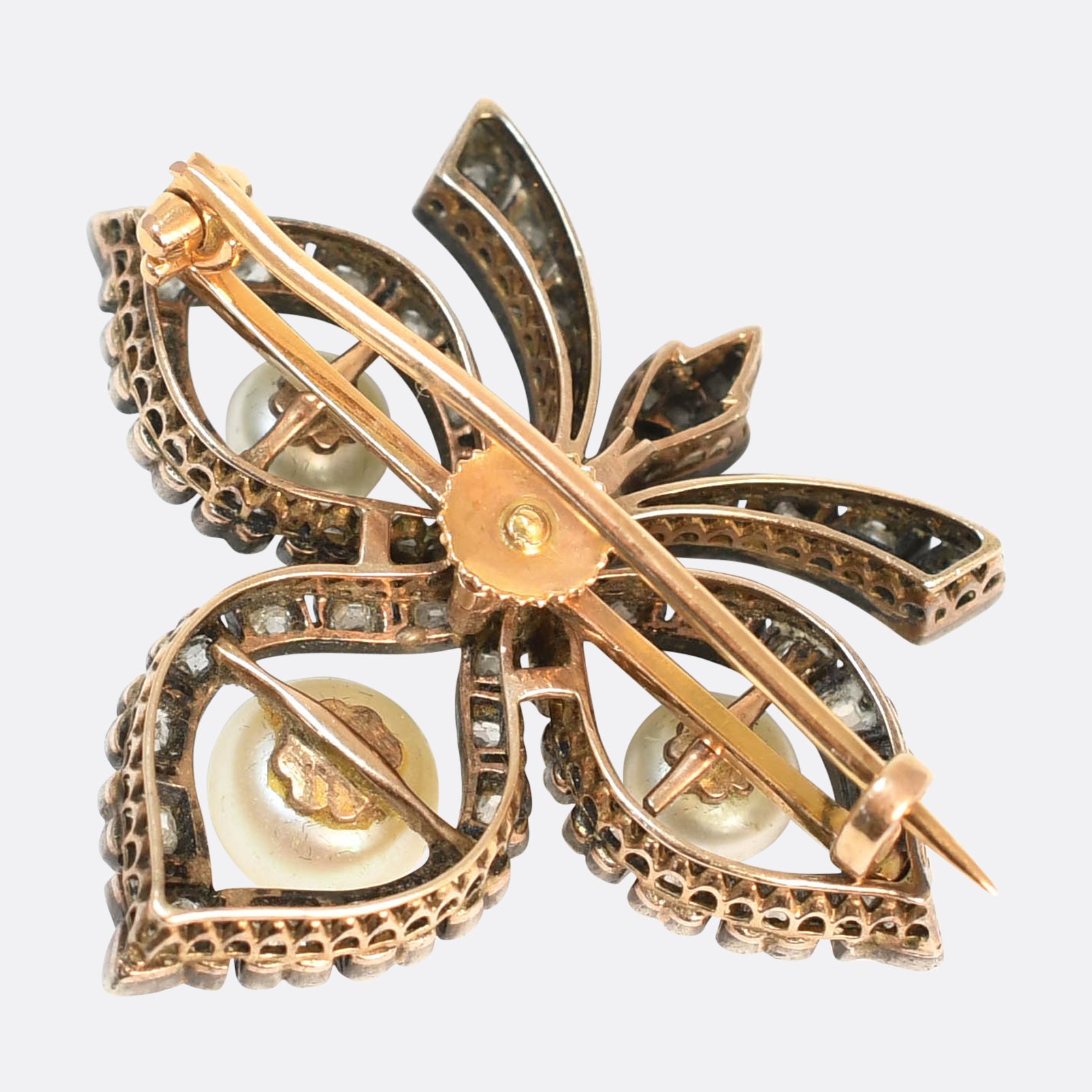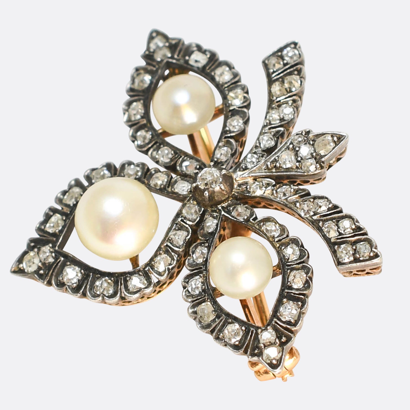 This stunning Victorian brooch is modelled as something quite floral... Much like the royal "Fleur De Lys" or the clover! Its gorgeously open worked, set with old cut diamond borders- just over half a carat total, with three natural dreamy pearls placed in the centre of each section. The stones rest in silver settings, whilst the piece is backed in 18k rosey/yellow gold with a finely pierced gallery. Wear it on your collar, or loop a chain through the back and wear as a pendant.