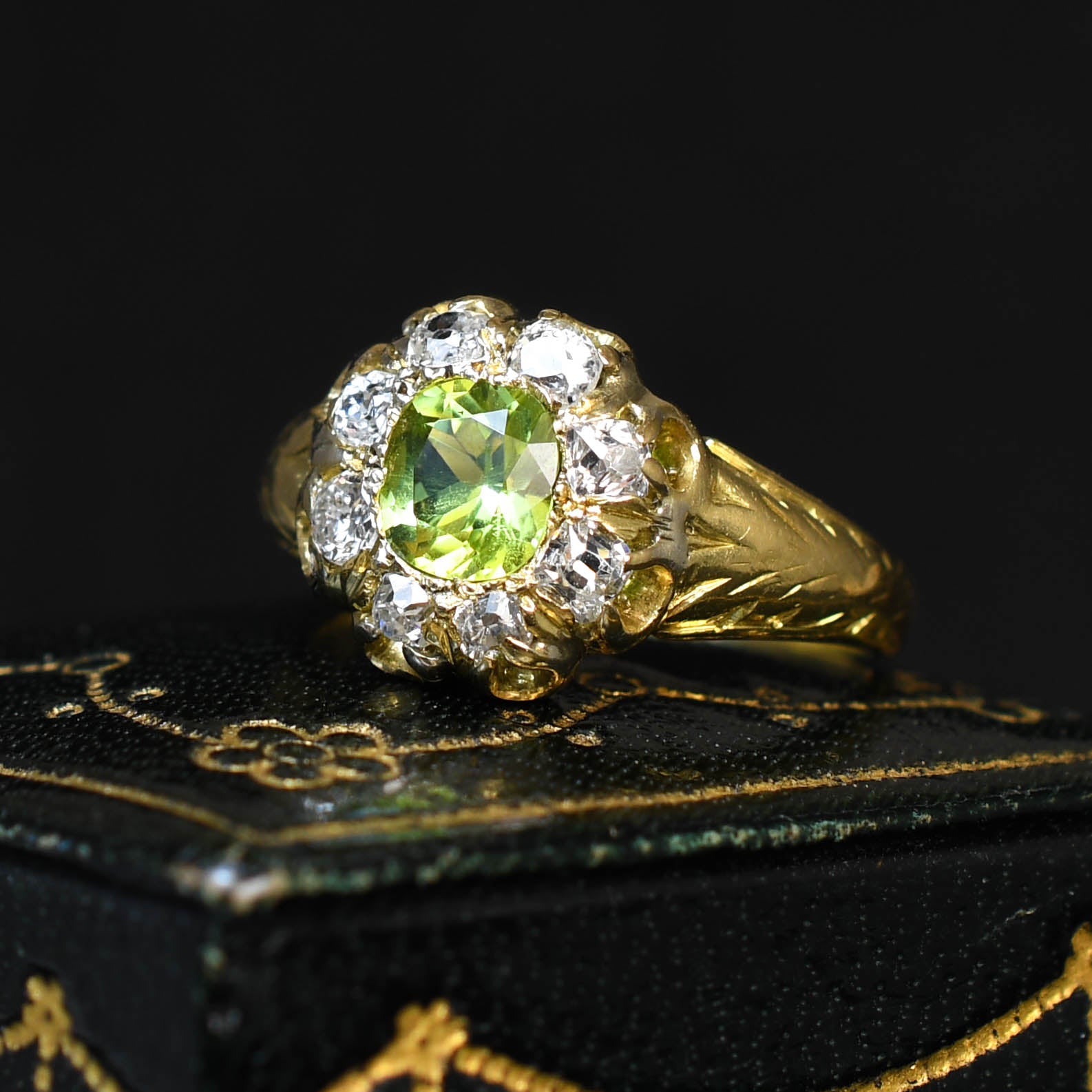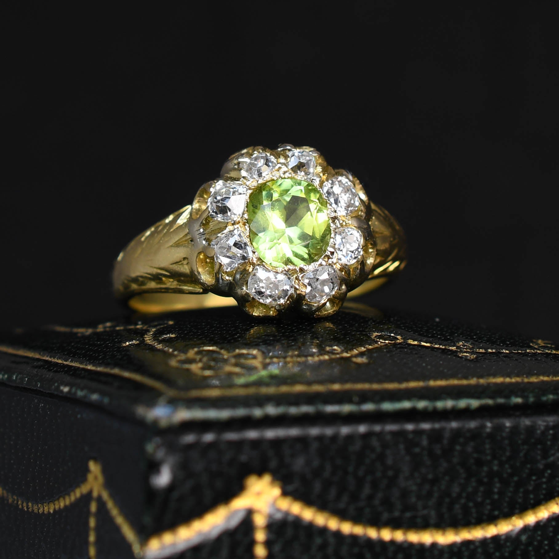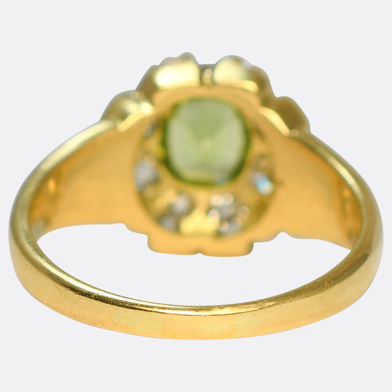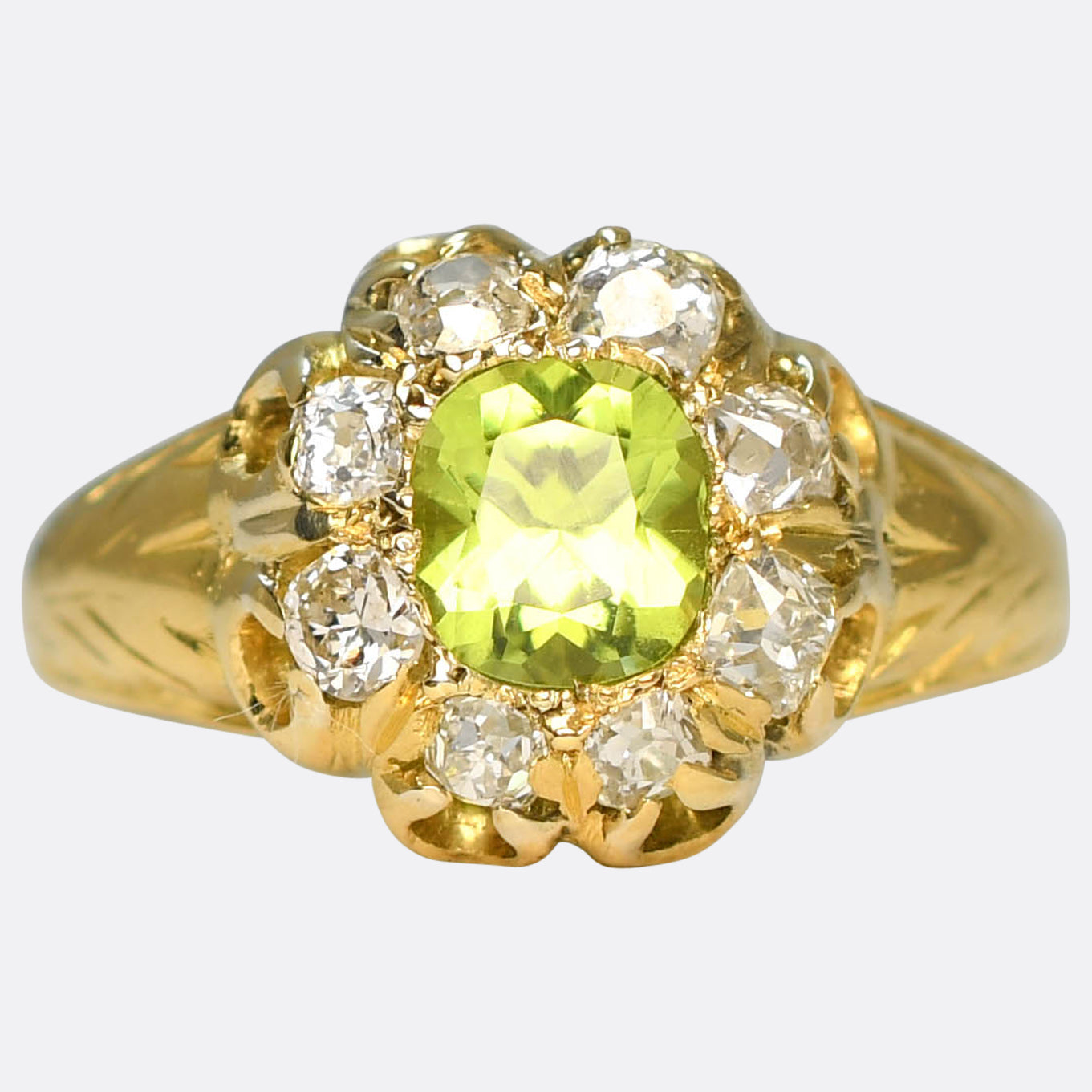 A stunning antique flower cluster ring, set with a central peridot surrounded by a halo of old cut diamonds. Dating to the Victorian period, circa 1870, the main stone is bright and vibrant, displaying excellent flash and fire, with a calculated weight of 0.64 carats. It's modelled in 18k gold throughout, and the head features pretty open worked details next to the stones, allowing the light to shine through them. It still looks wonderful over 150 years on!
