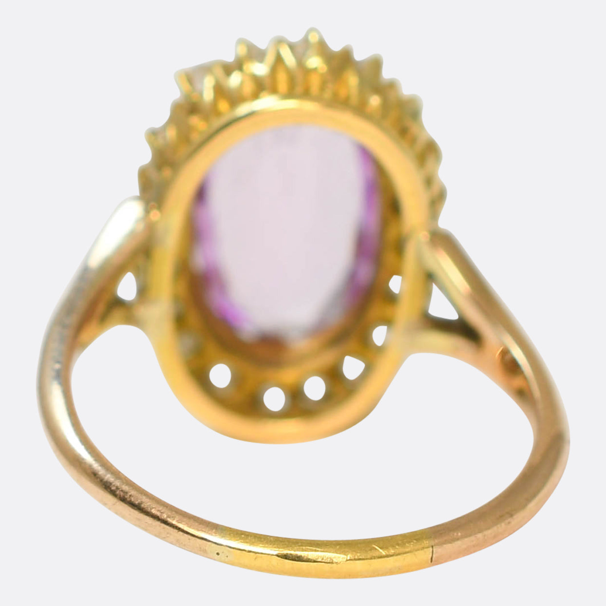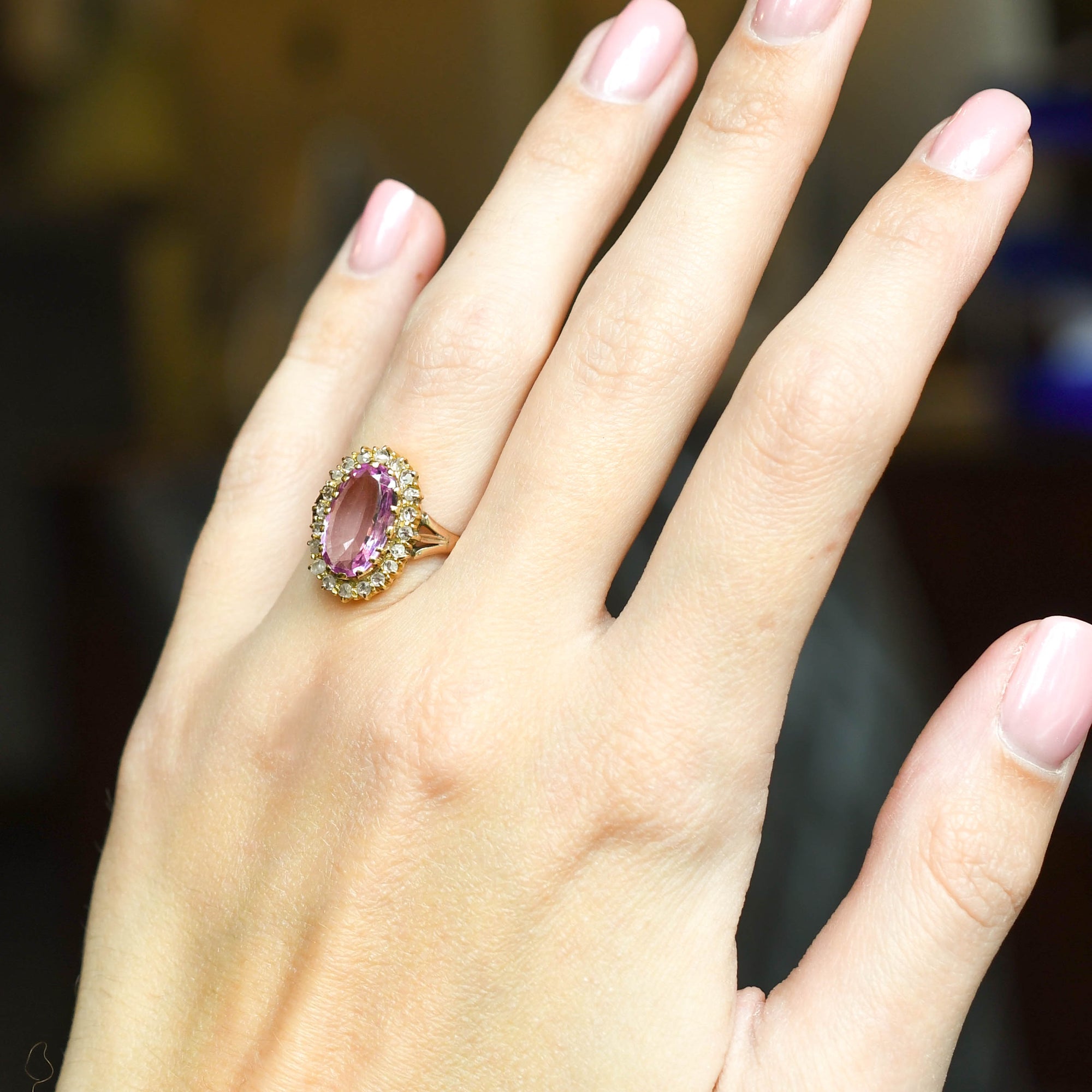 This gorgeous Victorian ring is set with the prettiest 4.09 carat pink topaz stone, surrounded by a cluster of rose cut diamonds. Its modelled in 18 karat yellow gold throughout, and the combination of gold, pink and white (diamonds), is absolutely gorgeous. It features a lovely pierced gallery, open backed settings and split shoulder details.