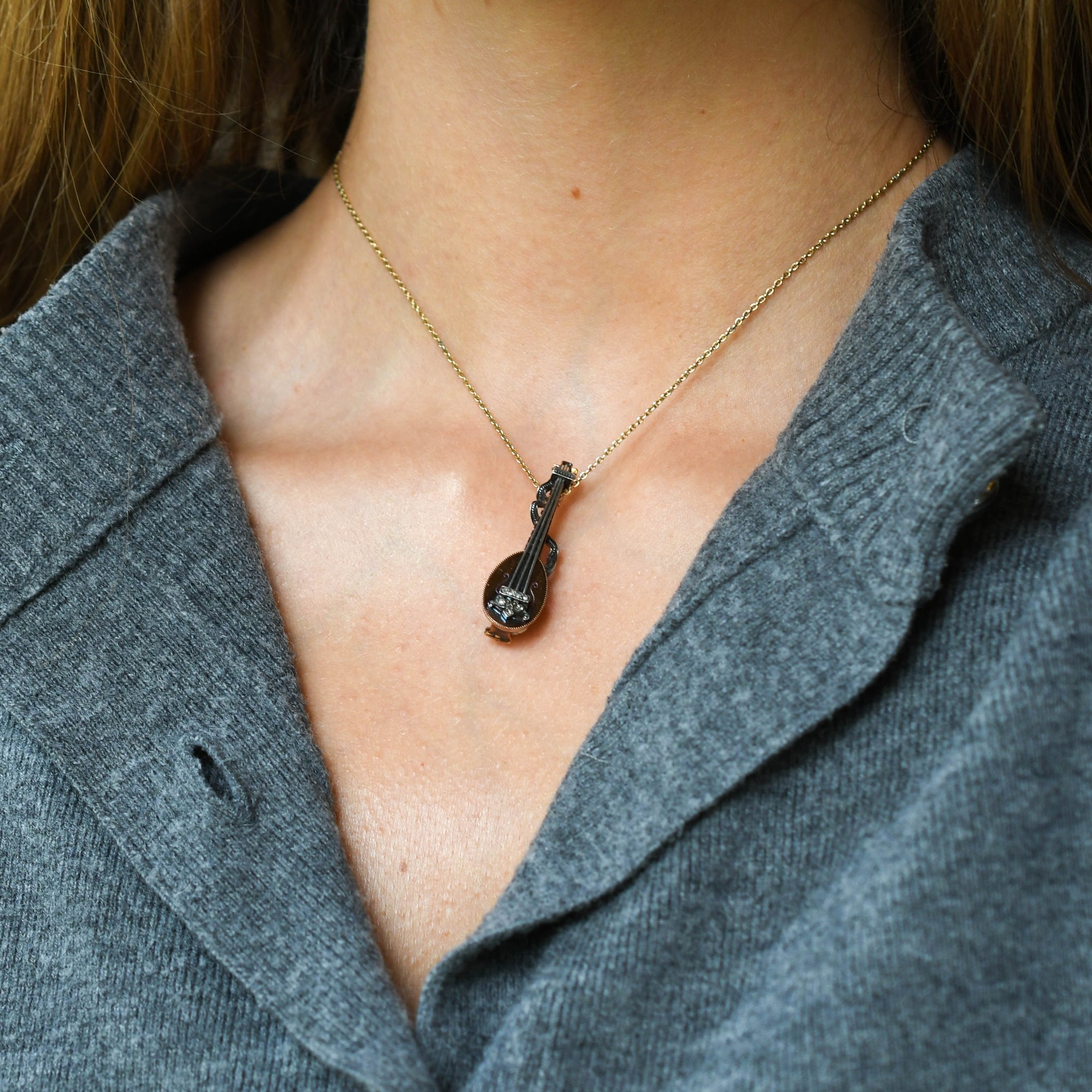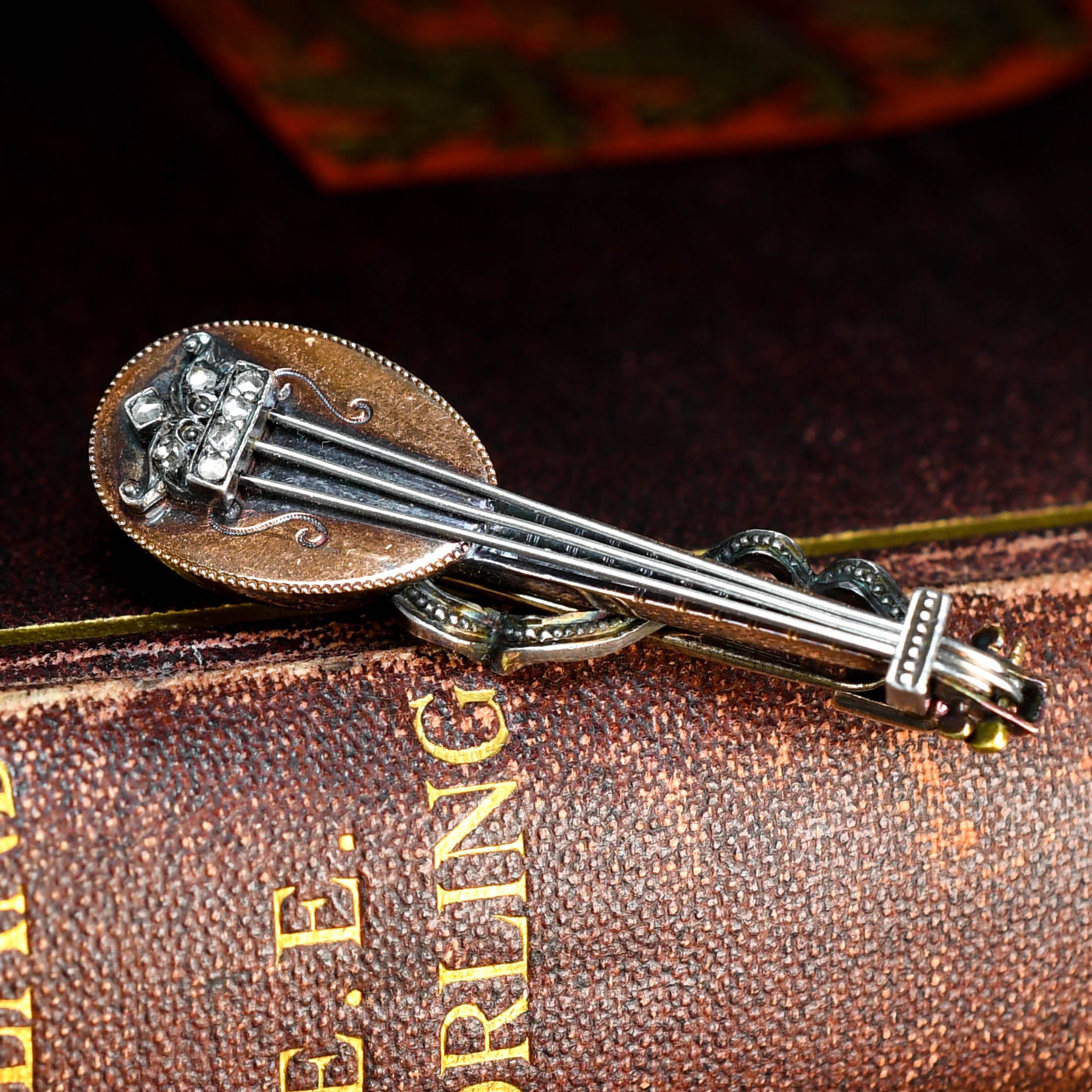 A charming music instrument pendant brooch, the Mandolin. Dating from the Victorian period, circa 1880, this gorgeous brooch pendant is modelled as a mandolin, set with rose cut diamond accents. Its a three-dimensional piece, with fine textured detail throughout and long silver "strings". It features a small silver ribbon wrapping around the piece, creating great movement. Its crafted in rosey 15 karat gold throughout, and can be worn as intended (as a brooch), or you can even loop a chain through!
