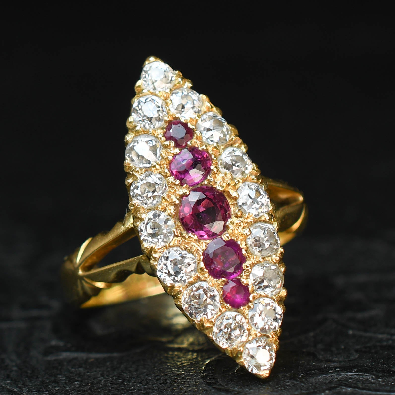 A striking antique navette ring set with a sparky cluster of old mine cut diamonds and a row of natural red rubies. The rubies graduate in size from the centre, displaying a gorgeous and intense pinky/red colour. The old cuts are bright and full of life, surrounding the centre stones and set in gold. 1.76 carats total. At each side of the North/South resting head are split shoulder details, leading to the rich 18 karat gold band.