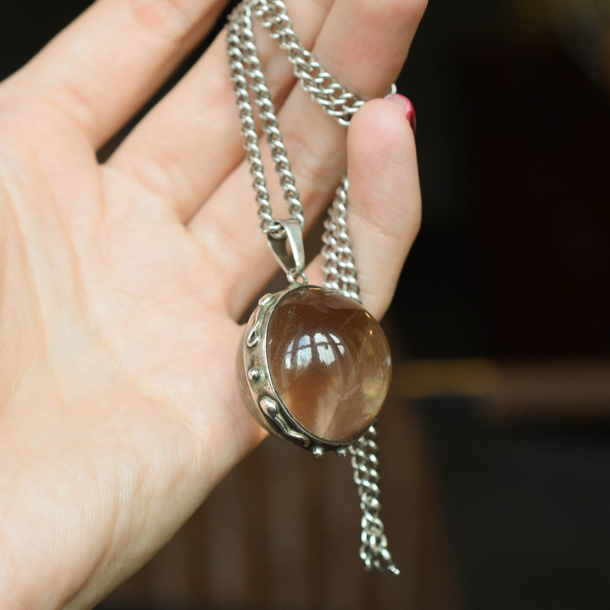 This cool Victorian rock crystal pendant is suspended from a silver curb link chain. Dating to circa 1890, the crystal is perfectly smooth and round in its exterior, and it magnifies everything you put behind it! It features silver fittings with pommel details and a chunky bail- looped is the silver curb link chain, 19.5 inches wearable length.