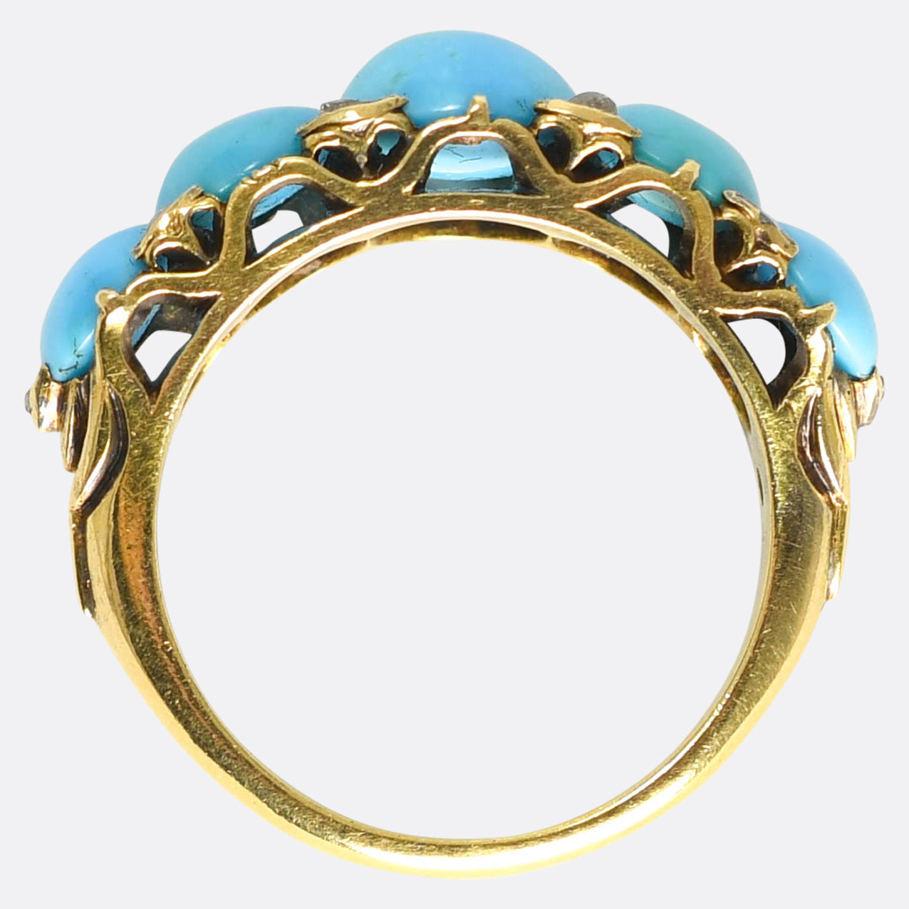 This cool and attractive antique 5-stone ring dates to the mid-Victorian era, c.1870. It's set with five large graduated turquoise cabochons, displaying vibrant colour, with rose cut diamond point accents nestled in-between each cabochon. Its modelled in 18k gold, and the shoulders and gallery display lovely open worked detailing.
