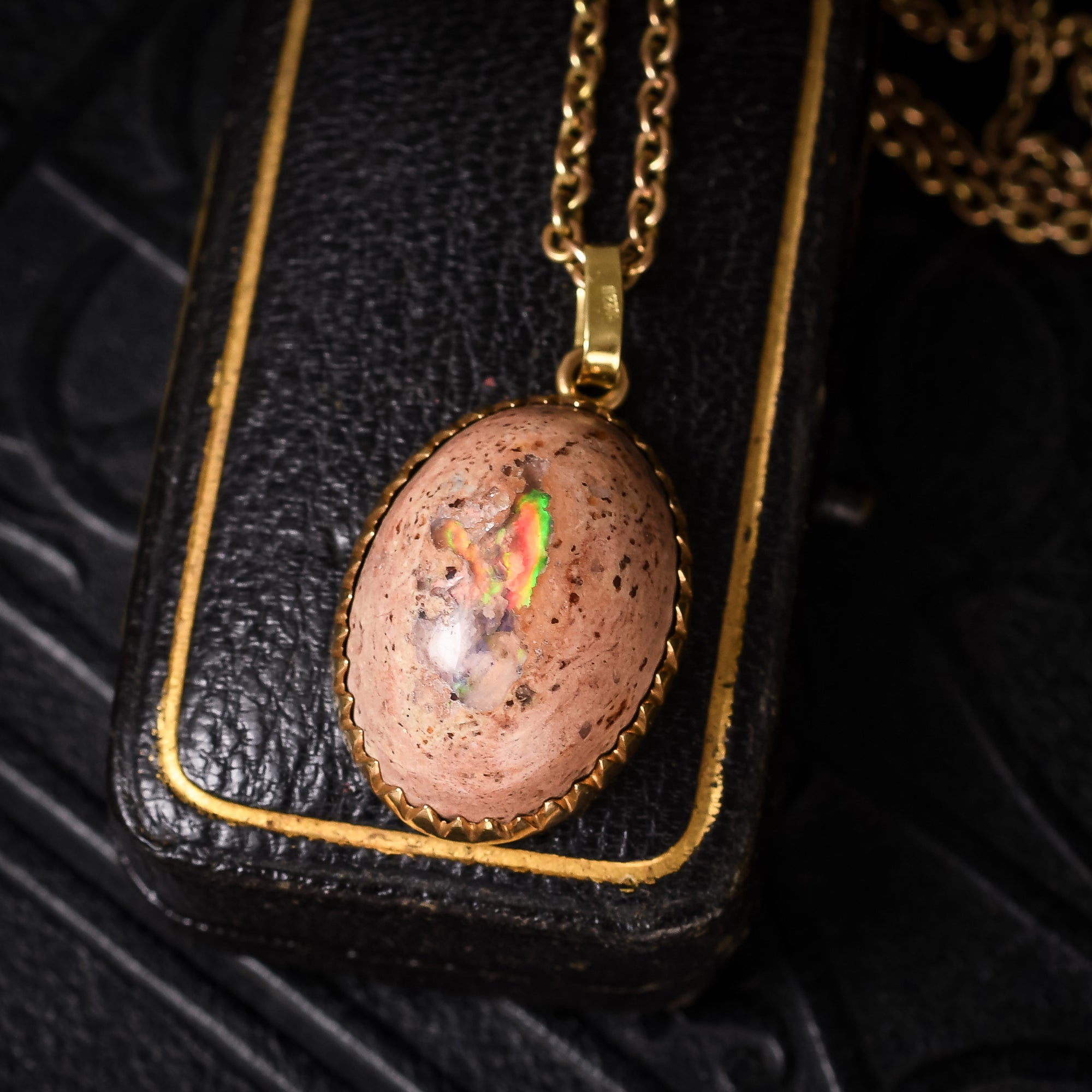 A cool vintage boulder opal pendant in 18k gold. The stone is a deep oval cabochon, with a pink rock matrix background and incredibly vibrant colourplay within. Dating from the 1980s, it's well made and stylish, with sharp tooth-like settings around the stone.