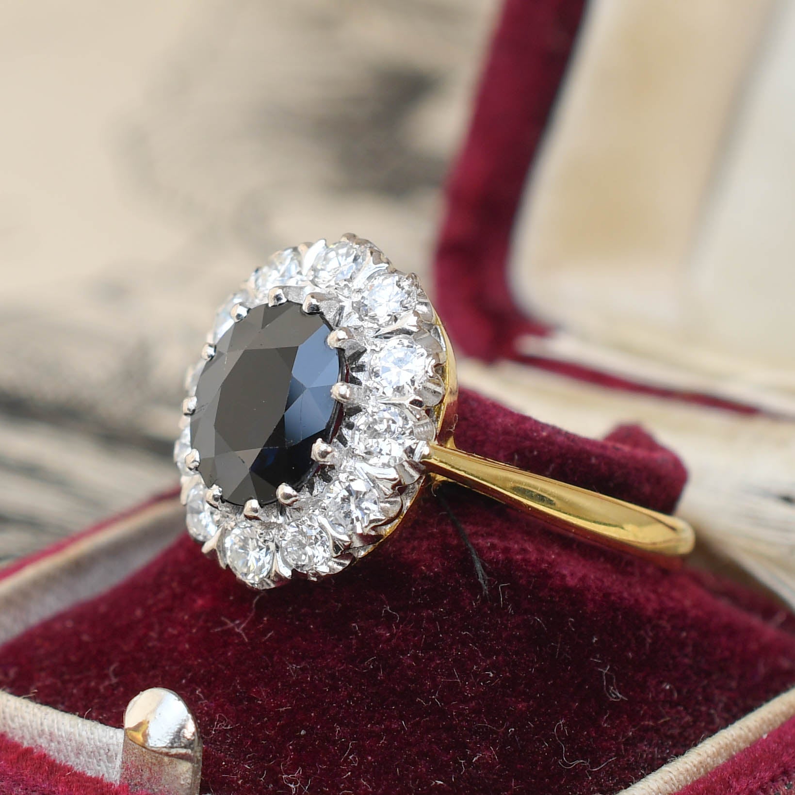 A super stunning Vintage cluster ring- aka the Lady Diana ring. Dating from the 1980's, its set with a dreamy deep blue 2.12 carat natural sapphire centre. Its white gold claw set and surrounded by 0.60 carat of bright white brilliant cut diamonds. It features a lovely and slim 18 karat yellow gold band, and it remains in lovely Vintage condition- perfect for a (royal) engagement or statement piece!