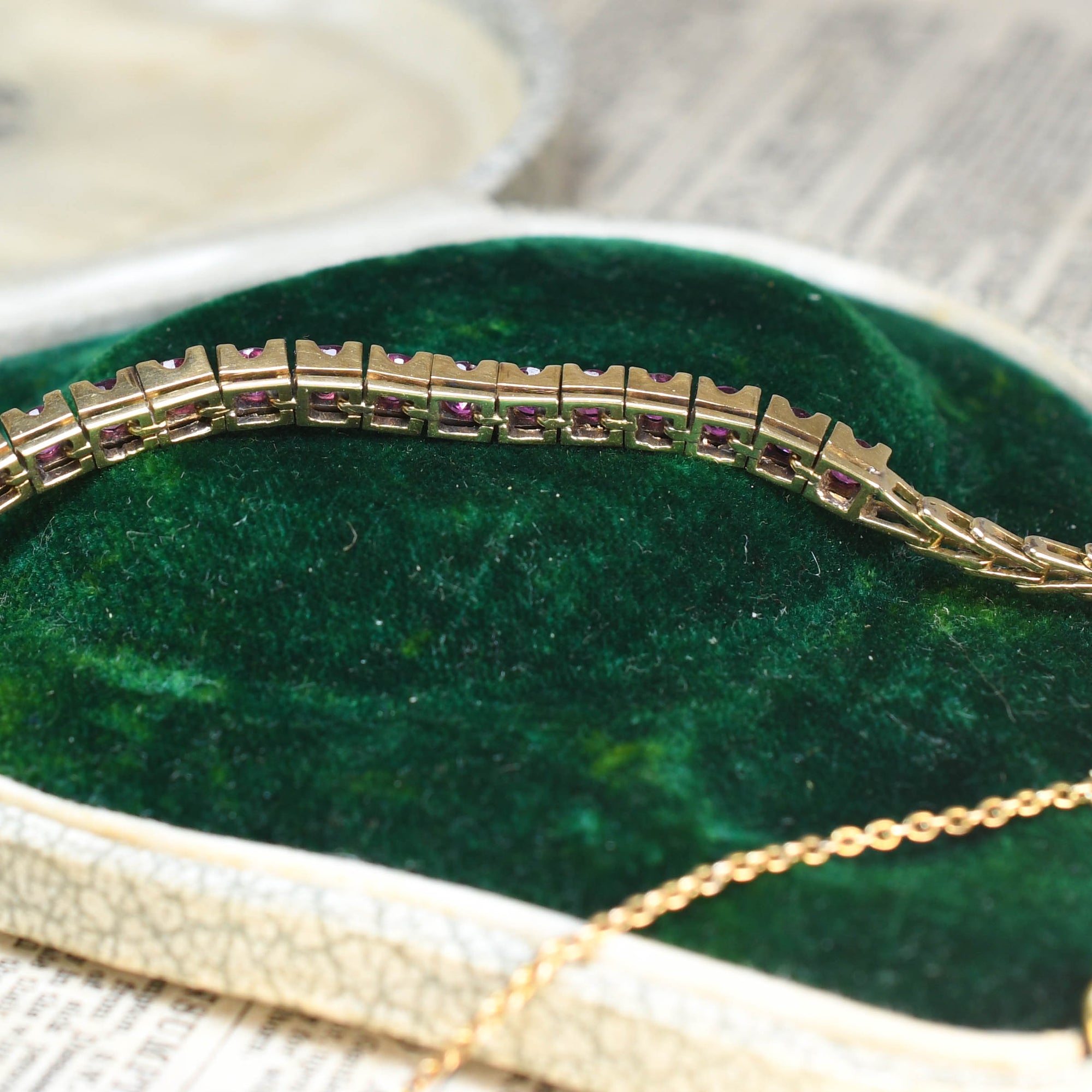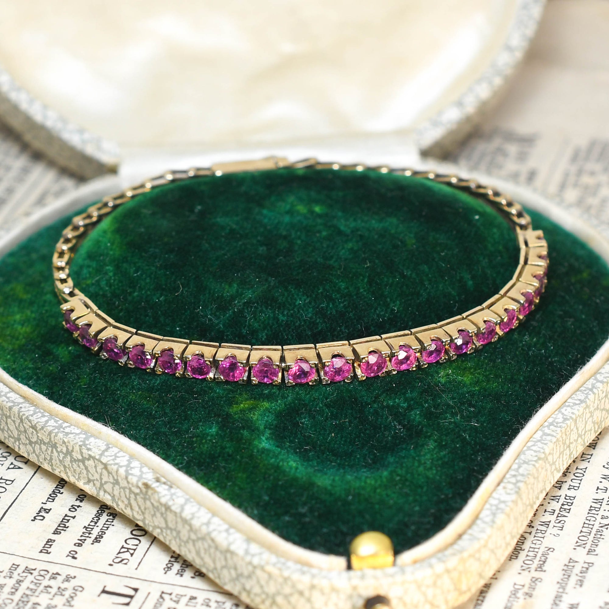 This charming Vintage bracelet features twenty gorgeous and juicy rubies, 2.6 carats total. They rest in square gold settings, along a slinky panel that leads to a fine gold bracelet chain link. The stones display a lovely pink hue, well saturated and perfectly complimented by the 14k yellow gold. Its made to fit a 6.8 inch wrist, look lovely worn and remains in lovely condition.