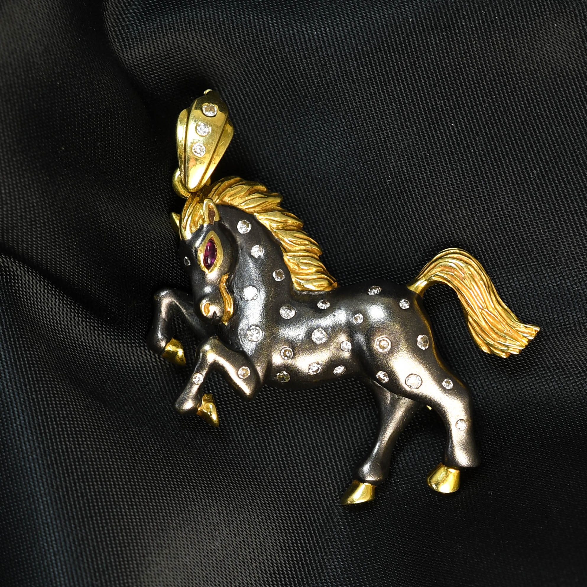 Calling all horse lovers... This Vintage brooch pendant is modelled as a loveable horse. Its rearing body is modelled in 18 karat yellow and oxidized gold- its mane, tail, hooves, eyes, nose (and the bail) are in yellow and the rest a dreamy dark sheen. Its invisibly set with brilliant cut diamonds across the body, and the eyes are set with ruby cabochons with a single diamond resting in-between. It almost looks magical! Wear on your jacket collar or loop a chain through the diamond set bail to wear as a pendant.