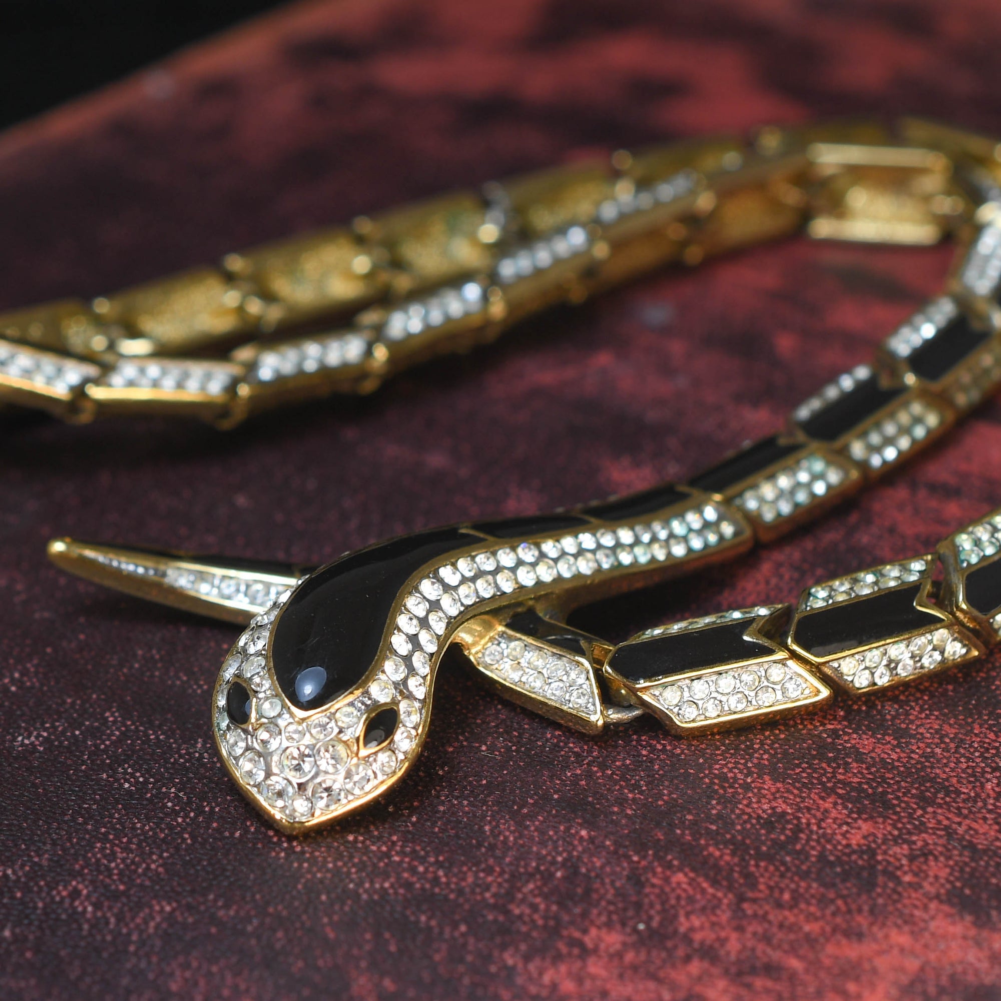 A cool and unusual Vintage costume necklace by Attwood & Sawyer. Modelled as a snake, this collar/necklace features a gorgeous black enamelled body, set with sparkly paste stones mimicking the scales of a snake. Its body is set into panels, moving like a snake in your hands while the head attaches to its tail, creating an eternal loop. Its gold plated and it measures 15 inches in length. Signed with Attwood & Sawyer marks - a great statement piece!