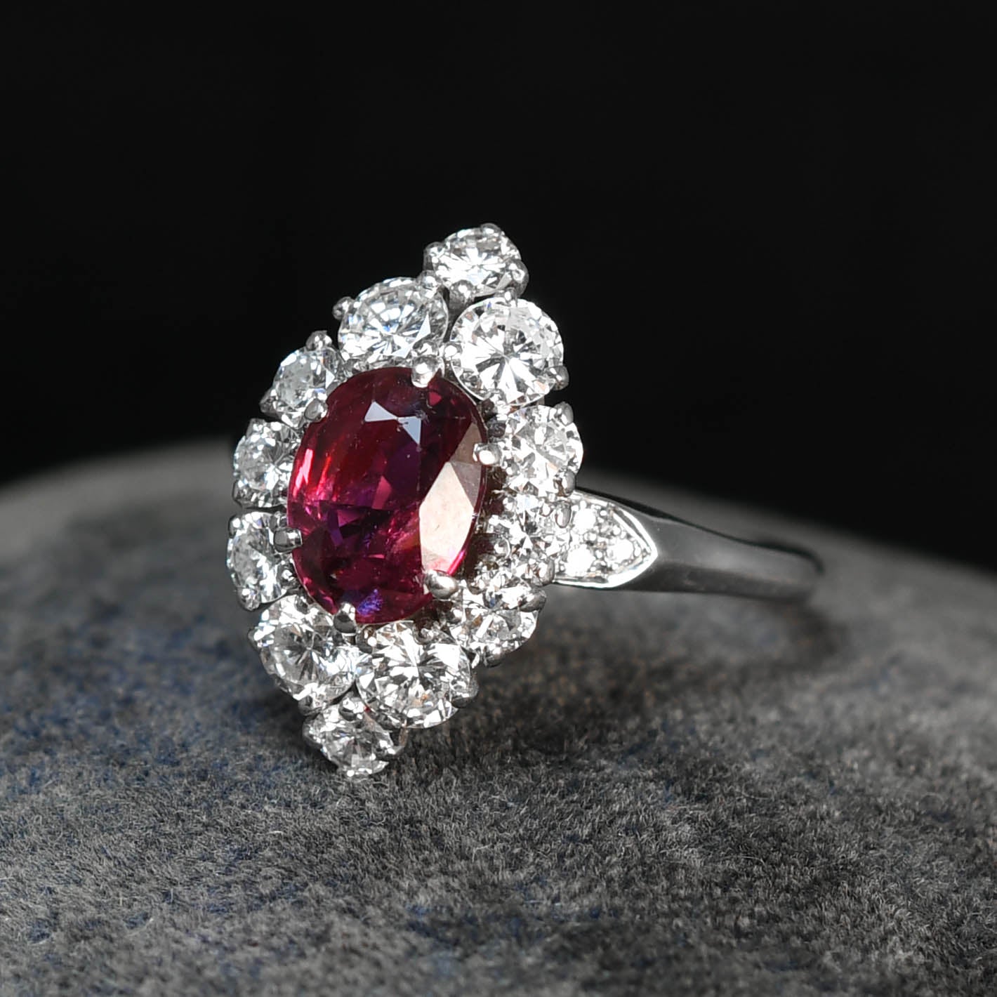 This attractive French made marquise shaped ring dates from the 1980's, and is set with the most gorgeous combo of brilliant cut diamonds and a juicy red ruby centre. Its modelled in 18 karat white gold throughout, with French marks indicating this to the back of the band. The ruby centre, 1.76 carats, displays a fantastic colour against the bright white diamonds, 1.80 carats total. The head rests with a high profile from the finger, with a gorgeously pierced gallery that curves to the shape of your finger. With small diamond set shoulders to finish the head, its a gorgeous stand out piece.