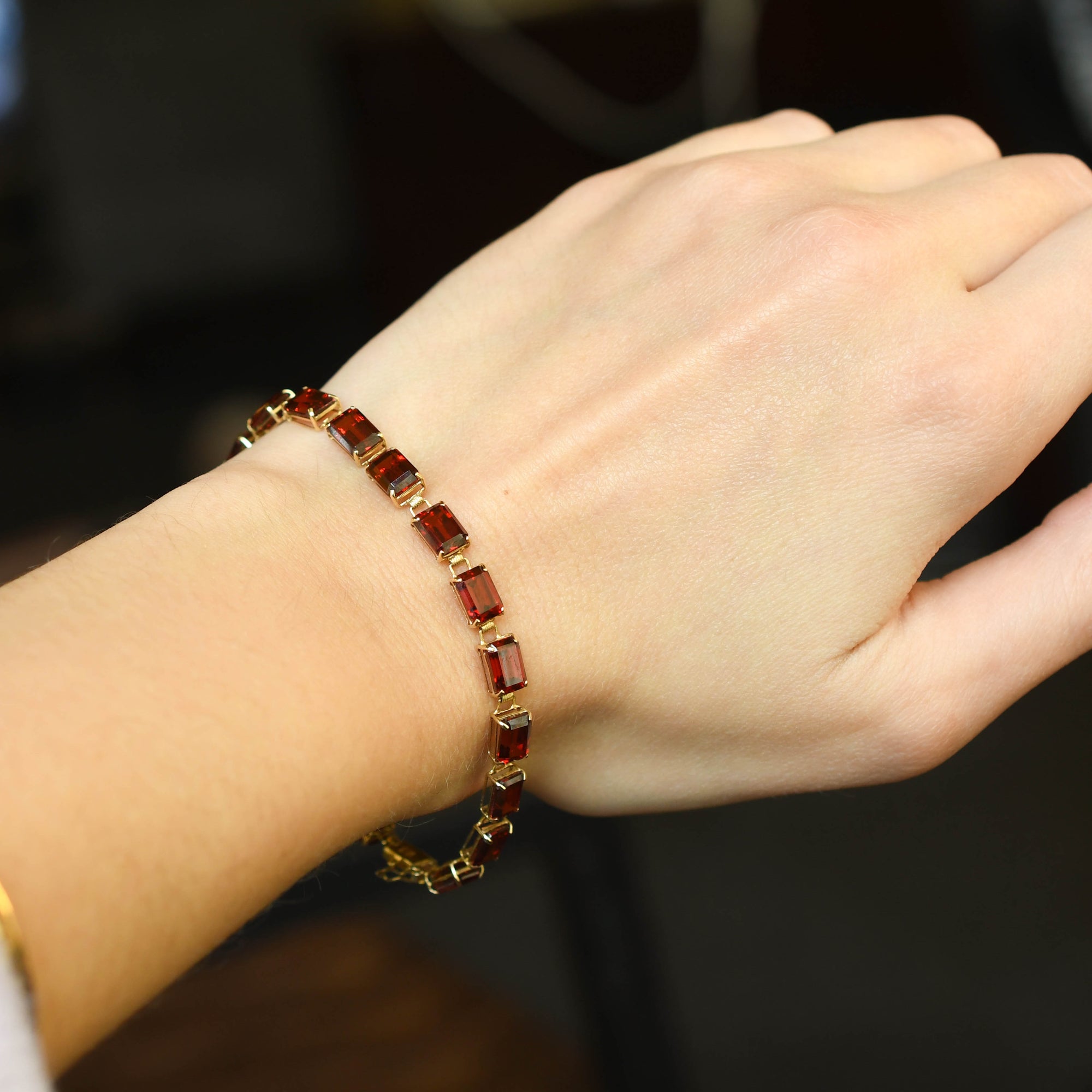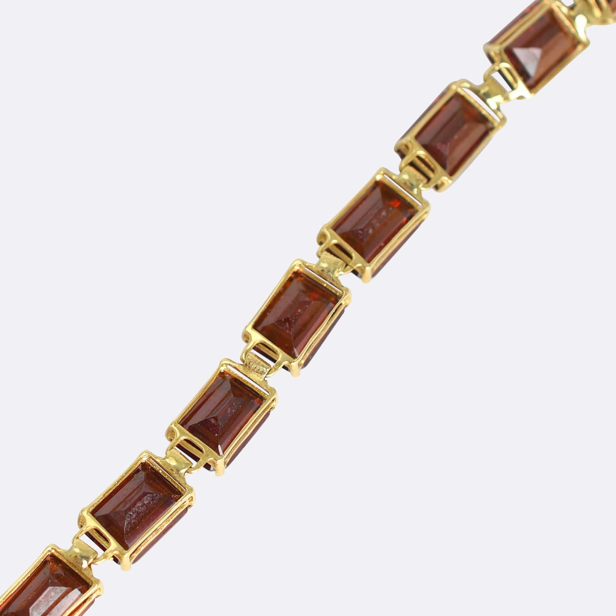 A striking Vintage line bracelet set with 18 juicy garnets, 21.78 carats total. The stones display a gorgeous red colour throughout, and complimented perfectly by the buttery 14 karat yellow gold settings. It features a gold clasp, with a wearable length of 7.2 inches, and it remains in lovely Vintage condition.