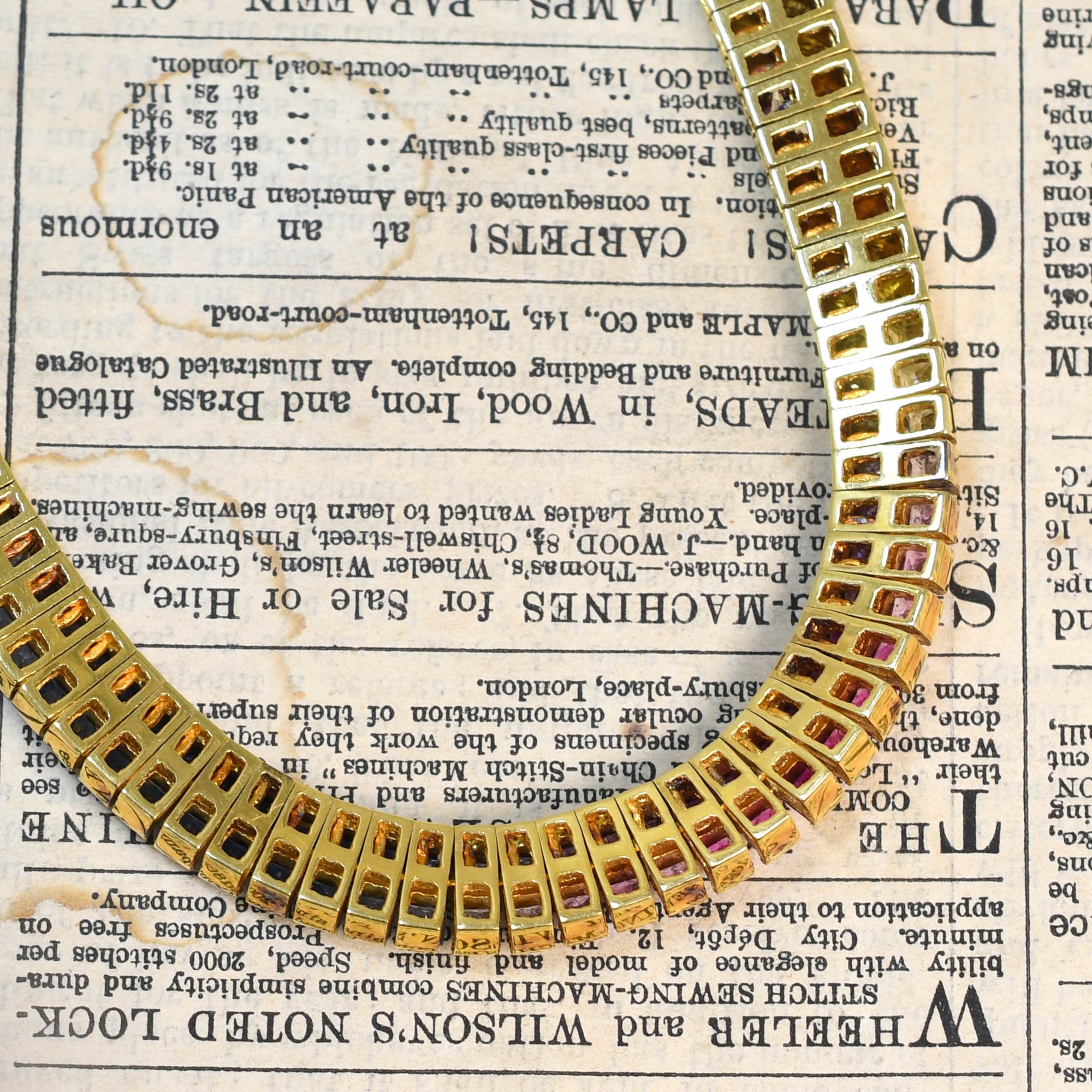 This Vintage gold necklace is a masterfully crafted creation, showcasing a stunning array of multi-coloured sapphires, approximately 7 carats total. The design makes a bold yet elegant statement, with each sapphire displaying fantastic colour against the buttery 18 karat yellow gold. The chain is made up of small gold panels, linked together creating a lovely sinuous wear, with a wearable length of 15.5 inches. It offers veritably for layering or stand alone wear, and it remains in excellent condition throughout.